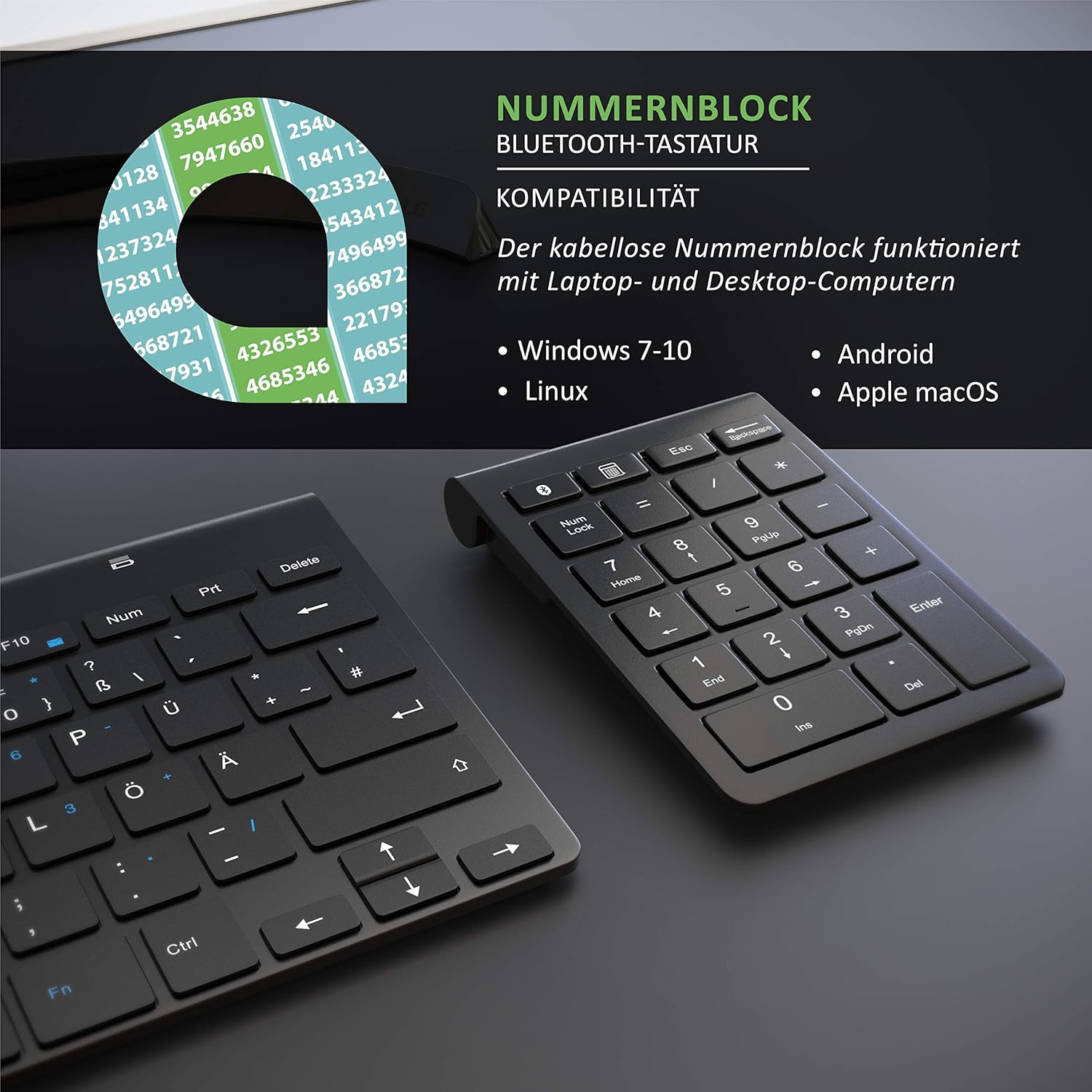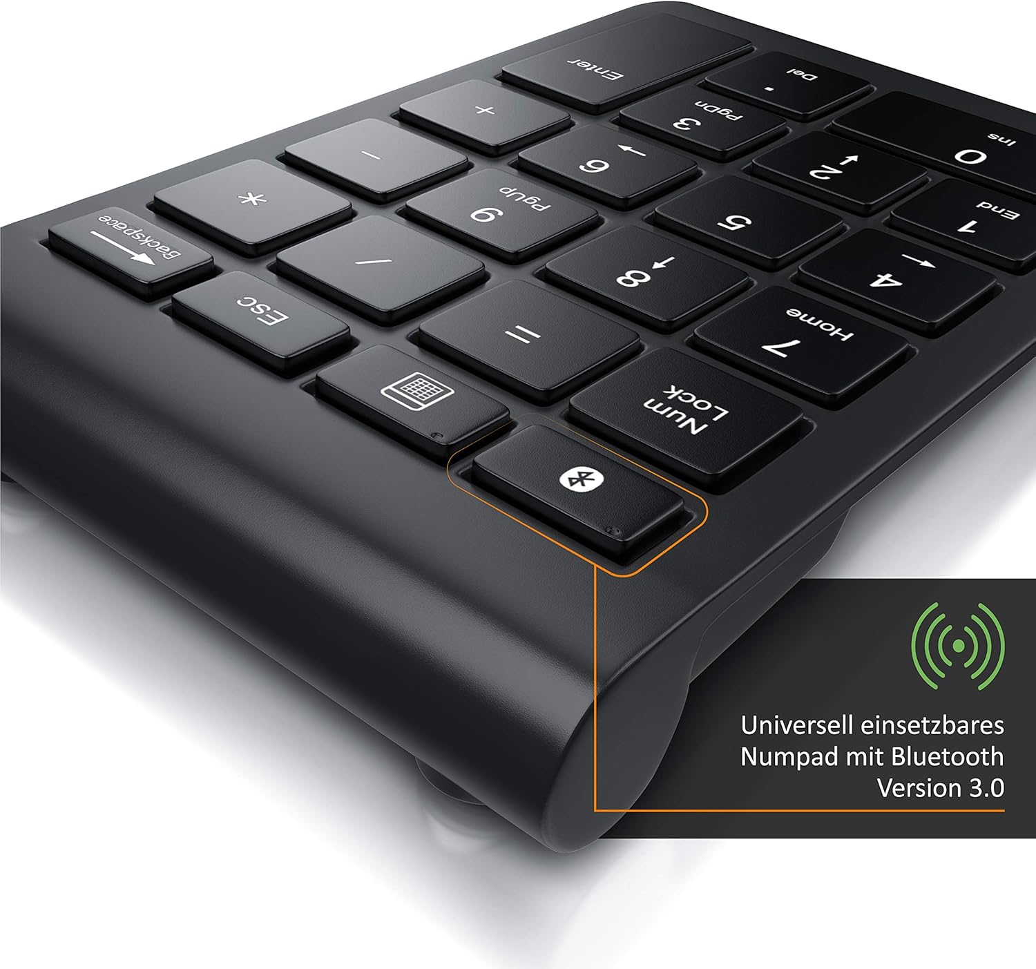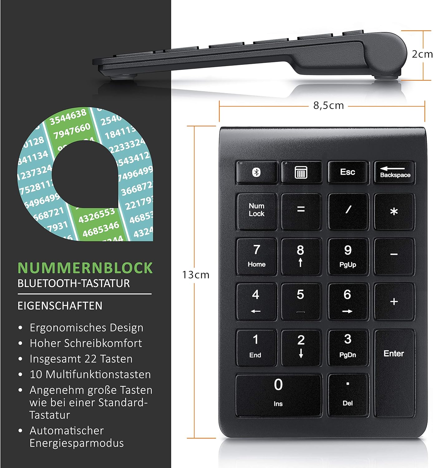 Универсален цифров блок с Bluetooth версия 3.0. Цифров блок с 22 клавиша, 6 реда клавиши един върху друг. Клавиатурата е наклонена напред за по-добра използваемост. 10 многофункционални клавиша. Активирайте бутона "NumLock" и една от цифрите от 1-0 или "." Стискайте. Функции: End, стрелка надолу, нагоре, наляво, надясно, pos1 (home), изображение нагоре и надолу, вмъкване и изваждане. Бутон със символ на калкулатор отваря компютъра с Windows. Приятно големи клавиши като на стандартна клавиатура, прецизна точка на натиск, бърза реакция. Автоматичен режим за пестене на енергия, предпазващ батерията. Удобни размери за лесно пренасяне. Съвместим с Windows 7-10, Linux и Android (няма функция за PgUp/PgDn/Home, e/End/= и Esc). За Apple macOS, функционират само цифров блок и цифрови символи.