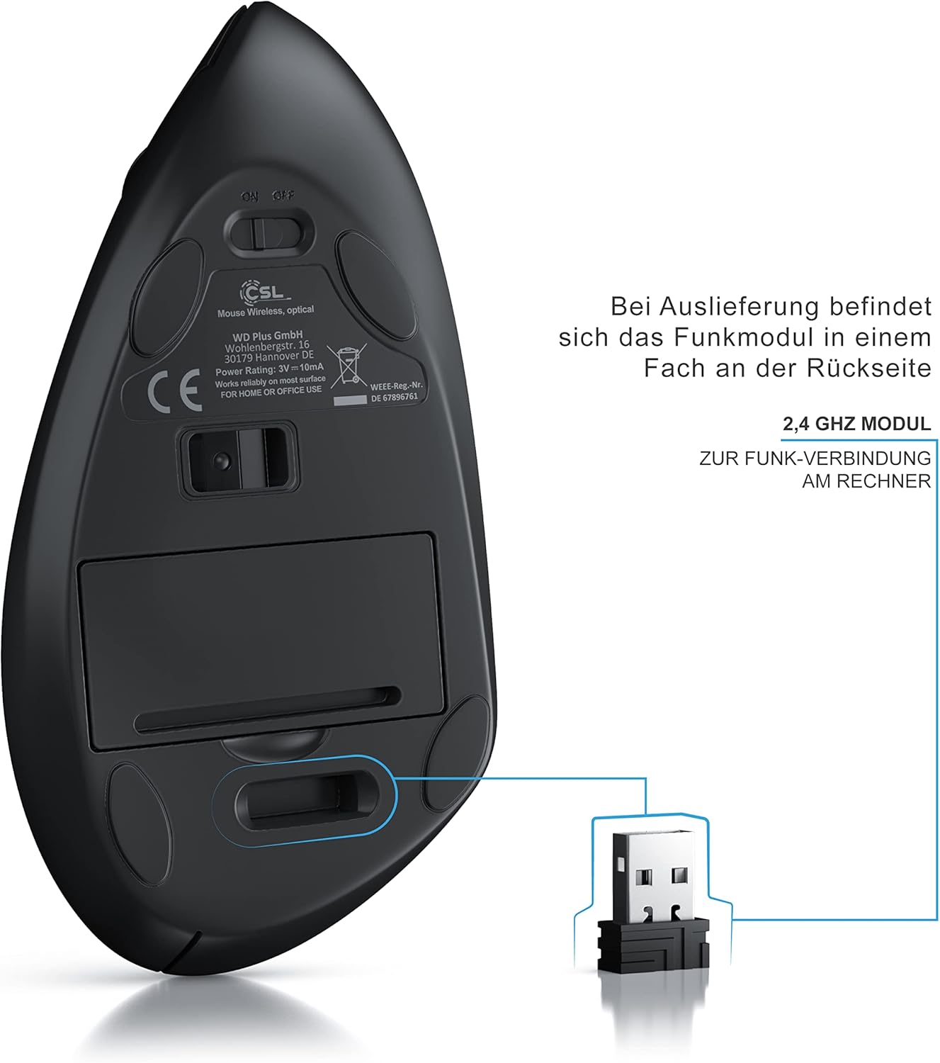 Тази вертикална мишка се поставя тук: Точно както при ръкостискане, ръката ви остава в отпусната поза. Ръката ви също е поддържана от ергономичния дизайн и неплъзгащата се повърхност на мишката. Безжичната мишка има десен и ляв бутон на мишката, бутон напред/назад за удобно сърфиране в интернет и превключвател за dpi, който ви позволява да превключвате между максималната честота на дискретизация от 1600 dpi по време на непрекъсната работа. Благодарение на оптичния сензор, вертикалната USB мишка работи върху почти всички повърхности с най-висока прецизност. Резюме на продукта: