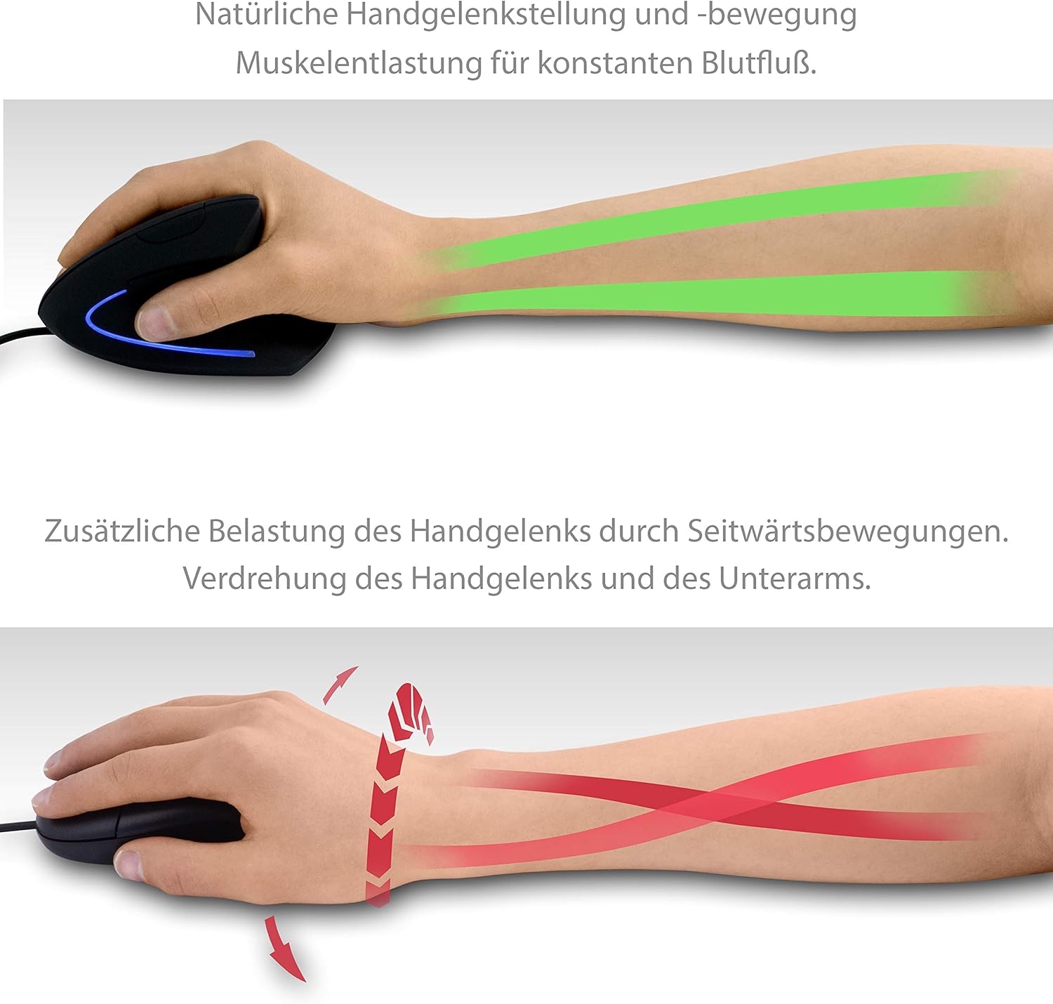 Тази вертикална мишка се поставя тук: Точно както при ръкостискане, ръката ви остава в отпусната поза. Ръката ви също е поддържана от ергономичния дизайн и неплъзгащата се повърхност на мишката. USB мишката има десен и ляв бутон на мишката, бутон напред/назад за удобно сърфиране в мрежата и превключвател за dpi, който ви позволява да превключвате честотата на дискретизация от 1000-1600 dpi по време на работа. Благодарение на оптичния сензор, вертикалната USB мишка работи върху почти всички повърхности с най-висока прецизност. Резюме на продукта: