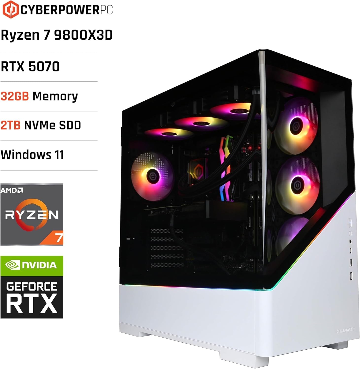 CYBERPOWERPC Луксозен геймърски компютър - AMD Ryzen 7 9800X3D, AMD Radeon RX 9070 XT 16GB, 32GB RAM, 2TB NVMe SSD, 750W 80+ захранване, Wi-Fi, водно охлаждане, Windows 11, Amethyst Curve RGB
