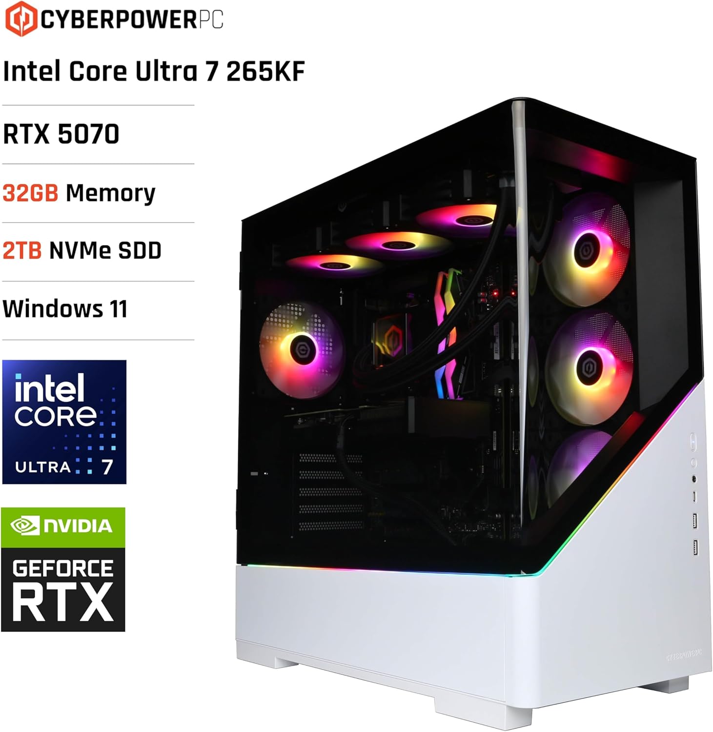 CYBERPOWERPC Луксозен геймърски компютър - Intel Core Ultra 7 265KF, AMD Radeon RX 9070 XT 16GB, 32GB RAM, 2TB NVMe SSD, 750W 80+ захранване, Wi-Fi, водно охлаждане, Windows 11, Amethyst Curve RGB