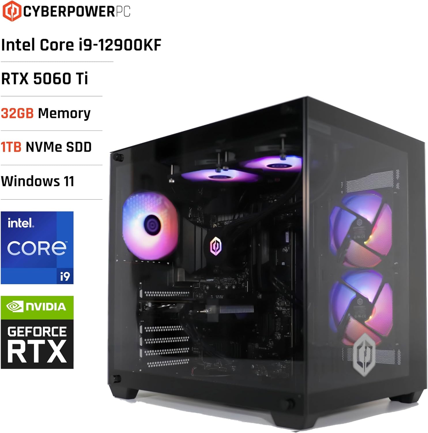 CyberPowerPC Luxe Геймърски компютър - Intel Core i9-12900KF, Nvidia RTX 5060 Ti 8GB, 32GB RAM, 1TB NVMe SSD, 750W 80+ захранване, Wi-Fi, течно охлаждане, Windows 11, Trigon RGB