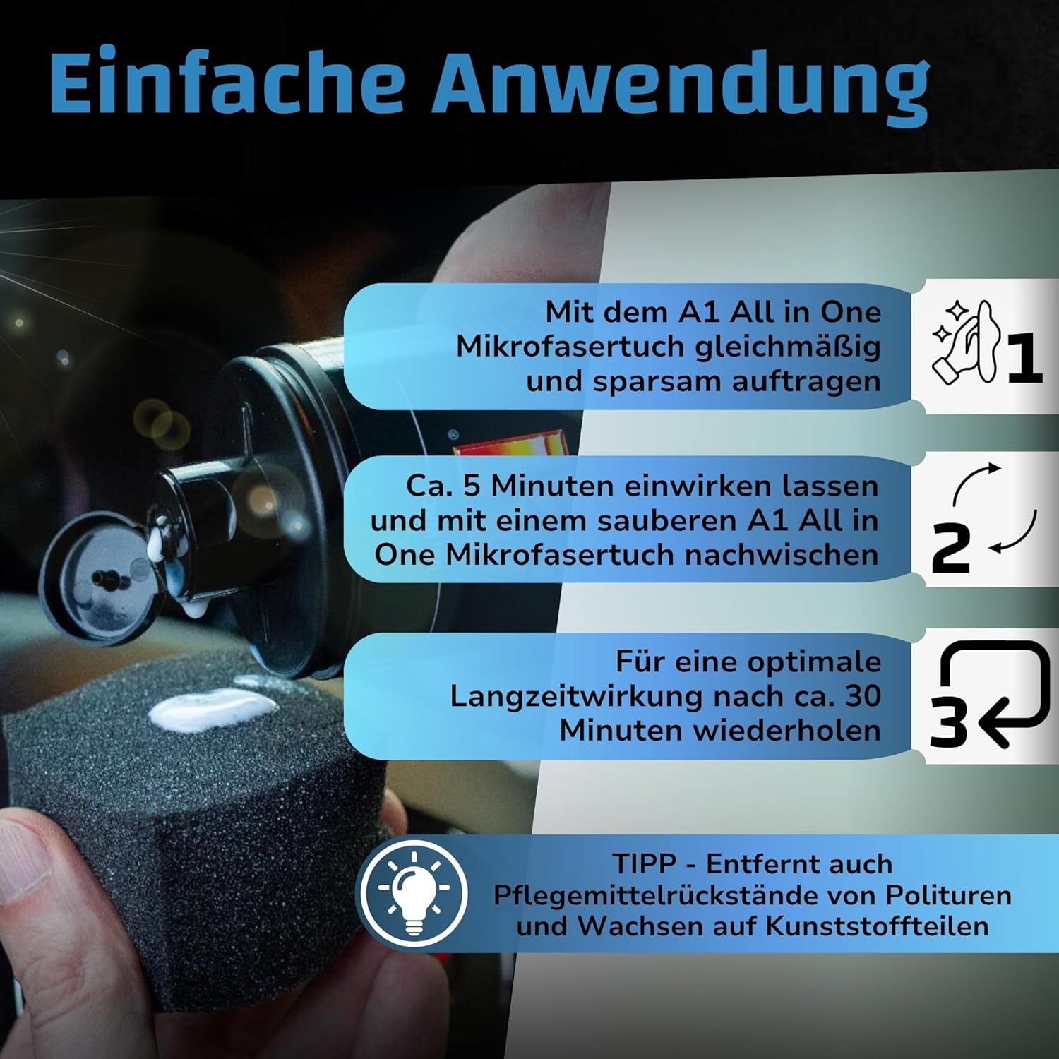 • Перфектна подготовка – продуктът за грижа без разтворители лесно почиства замърсени повърхности, премахва остатъци от полиращи средства и восък, намалява отблясъците на арматурното табло в предното стъкло и има антистатично действие, което прави повърхността прахоотблъскваща.