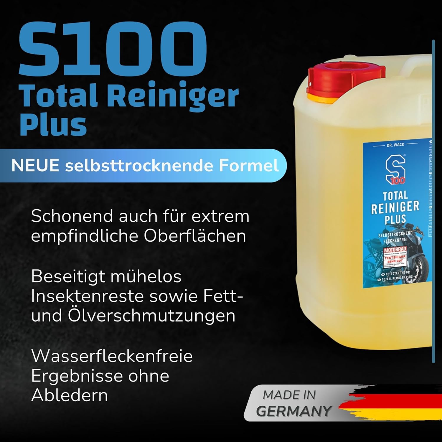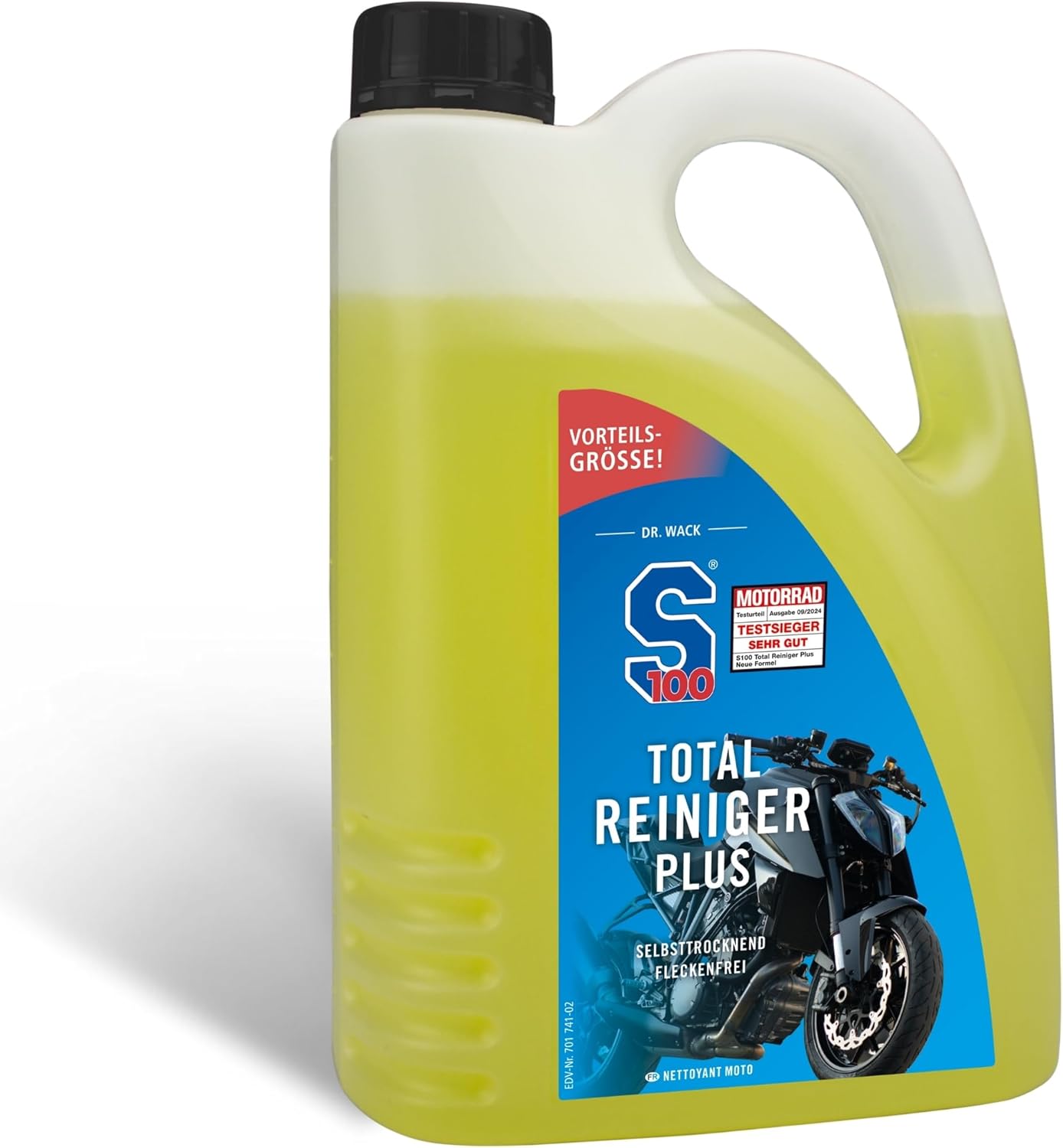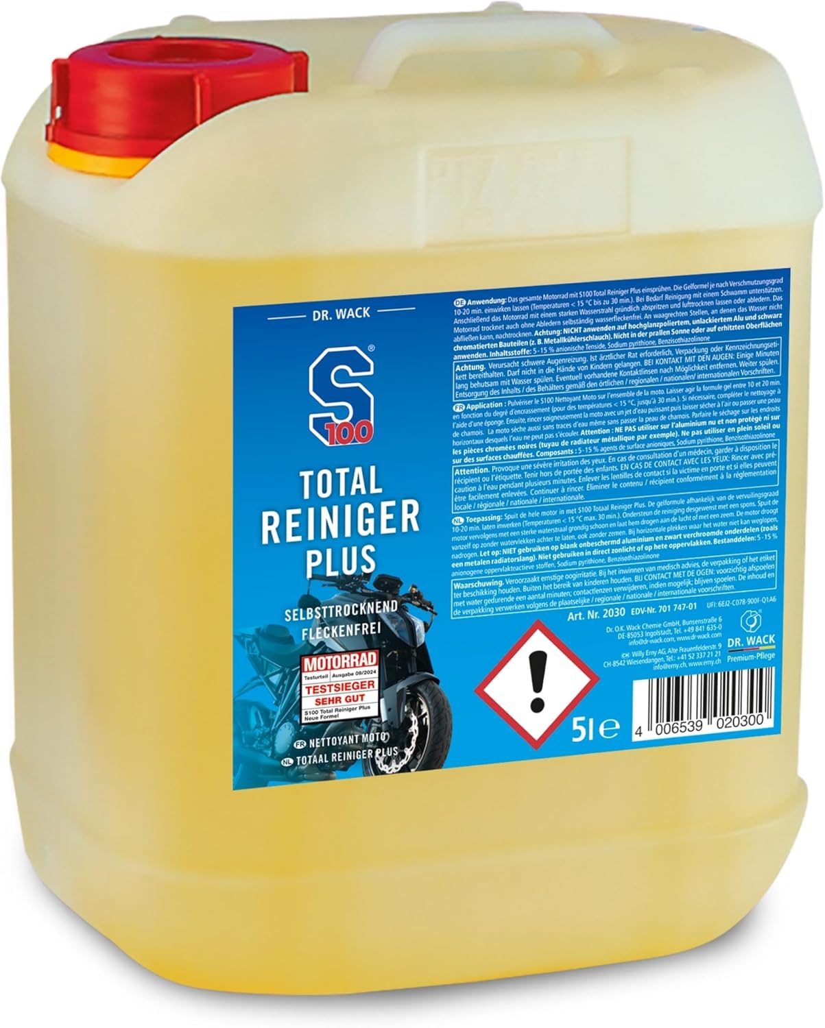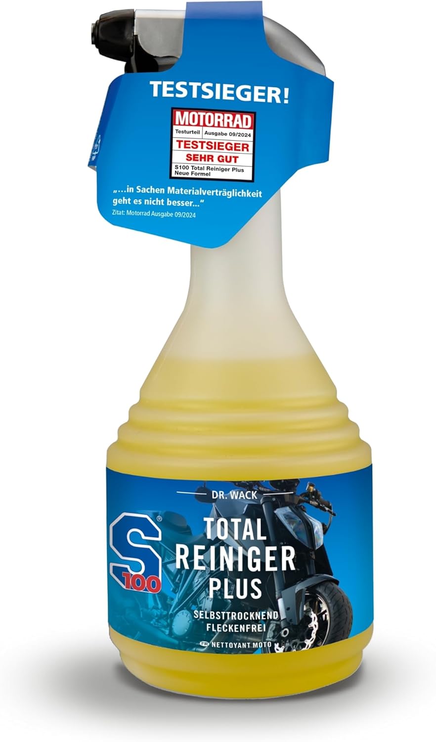 Открийте S100 Total Cleaner Plus от Dr. Wack - най-доброто решение за лъскави повърхности. Нашият високоефективен почистващ препарат е подходящ за мотоциклети и сега почиства още по-ефективно, дори и най-упоритите замърсявания, така че вашият мотоциклет отново да блести с нов блясък. Благодарение на новата формула с мощен гел, почистващият препарат за мотоциклети впечатлява с най-висок добив и почистващ ефект и без усилие премахва дори упорити замърсявания, като остатъци от насекоми или замърсявания от масла и мазнини - без да уврежда повърхността. Почистването с нашия безкиселинен почистващ препарат е не само бързо и ефективно, но и много нежно към материалите. Почистващият спрей е идеален и за чувствителни повърхности, като прахово боядисване, и изсушава вашия мотоциклет без петна от кожа и вода. Освен това, новата пръскаща глава гарантира, че можете да пръскате и с главата надолу, така че да достигнете до труднодостъпни места по мотоциклета. Нанасянето на препарата е много лесно. Просто напръскайте целия мотоциклет с S100 Total Cleaner Plus, като гел формулата зависи от степента на замърсяване от 5 до максимум. Оставете за 30 минути и подпомогнете почистването с гъба, ако е необходимо. След това изплакнете мотоциклета обилно със силна струя вода и го оставете да изсъхне - сушете на хоризонтални места, където водата не може да се оттече. Пълният почистващ препарат е идеален за тези, които ценят правилната грижа за мотоциклета, и е един от най-добрите почистващи продукти на пазара. Кажете сбогом на мръсните повърхности и разчитайте на S100 Total Cleaner Plus за надеждно почистване и дълготраен блясък.