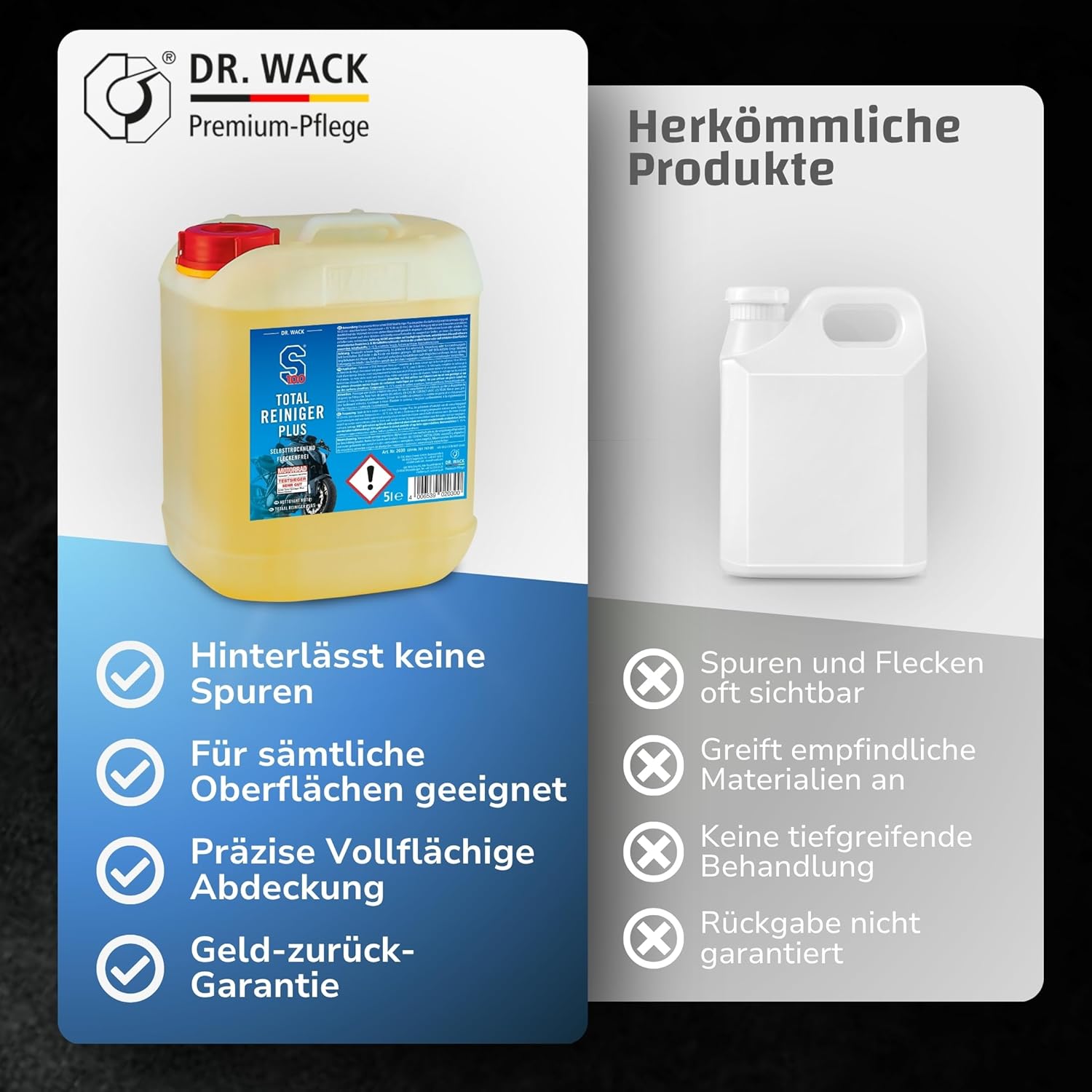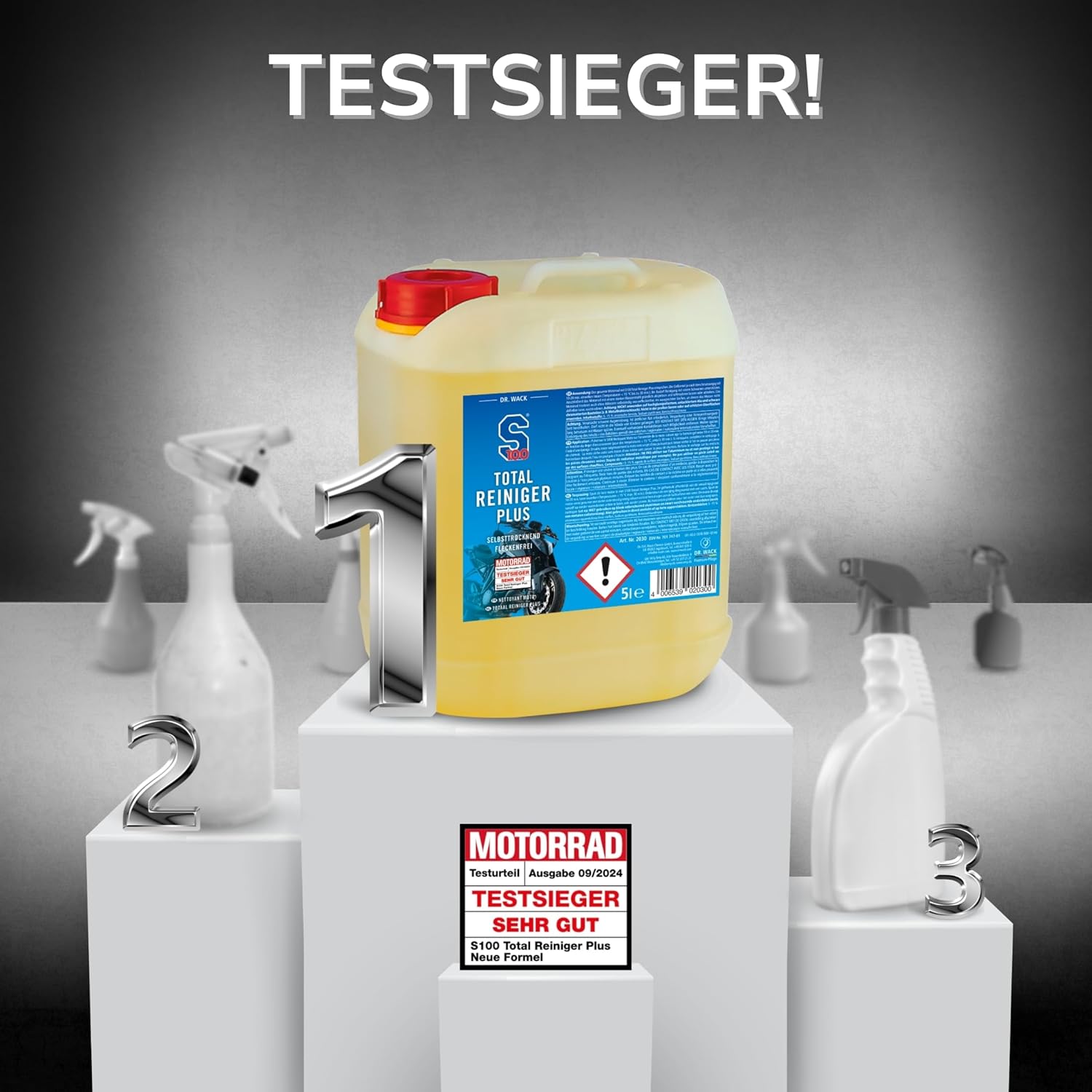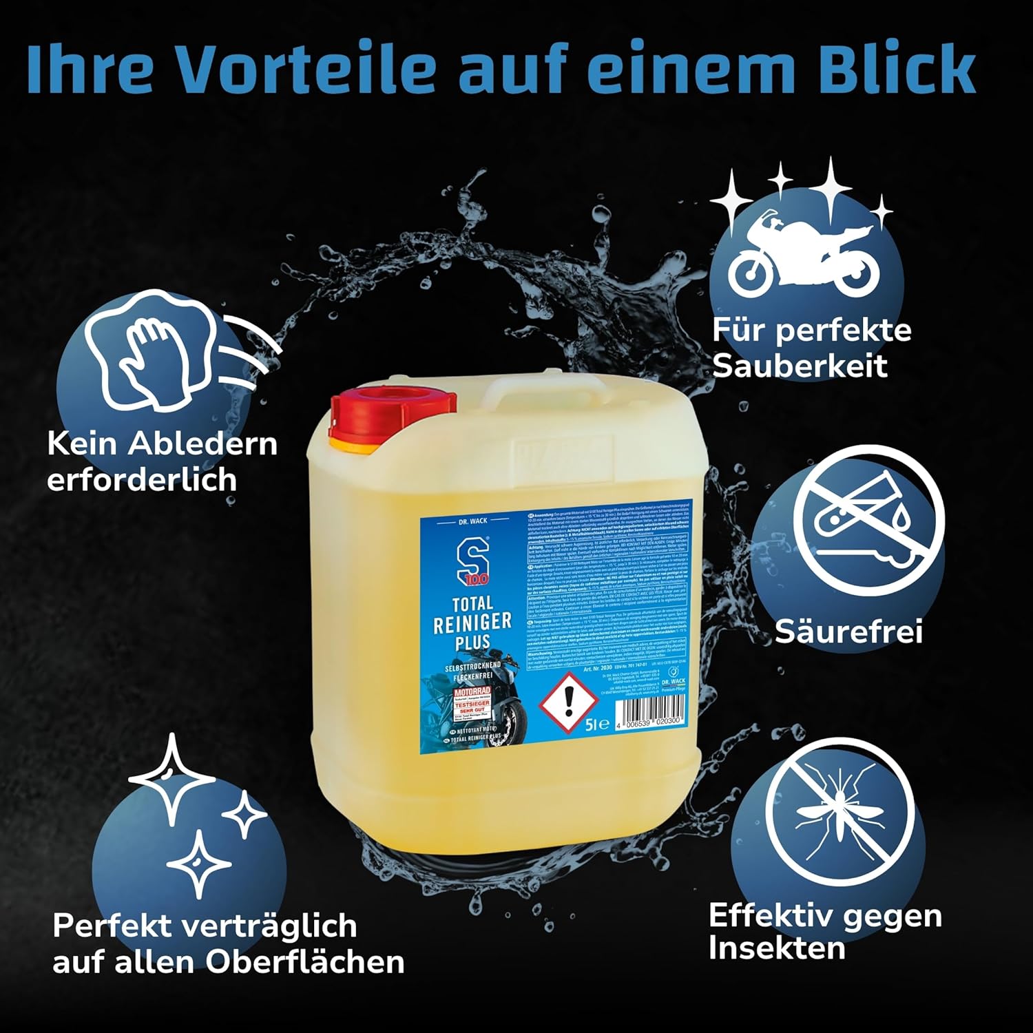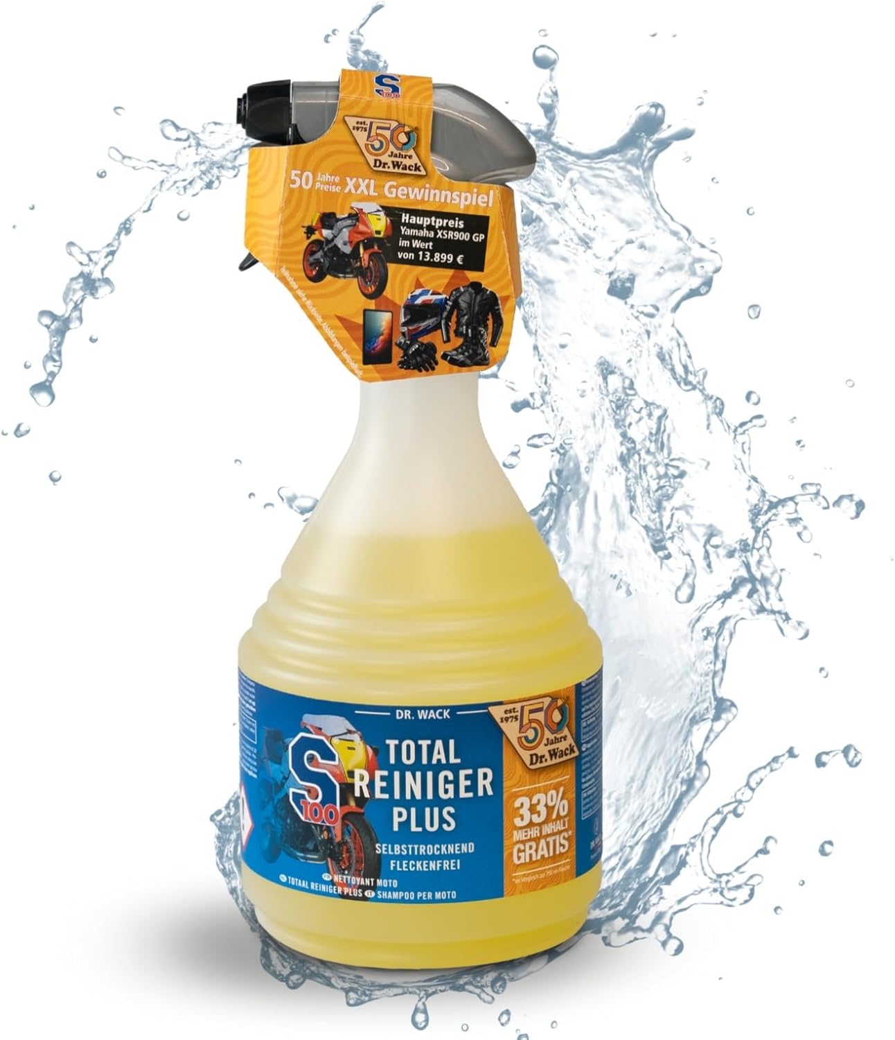 Открийте S100 Total Cleaner Plus от Dr. Wack - най-доброто решение за лъскави повърхности. Нашият високоефективен почистващ препарат е подходящ за мотоциклети и сега почиства още по-ефективно, дори и най-упоритите замърсявания, така че вашият мотоциклет отново да блести с нов блясък. Благодарение на новата формула с мощен гел, почистващият препарат за мотоциклети впечатлява с най-висок добив и почистващ ефект и без усилие премахва дори упорити замърсявания, като остатъци от насекоми или замърсявания от масла и мазнини - без да уврежда повърхността. Почистването с нашия безкиселинен почистващ препарат е не само бързо и ефективно, но и много нежно към материалите. Почистващият спрей е идеален и за чувствителни повърхности, като прахово боядисване, и изсушава вашия мотоциклет без петна от кожа и вода. Освен това, новата пръскаща глава гарантира, че можете да пръскате и с главата надолу, така че да достигнете до труднодостъпни места по мотоциклета. Нанасянето на препарата е много лесно. Просто напръскайте целия мотоциклет с S100 Total Cleaner Plus, като гел формулата зависи от степента на замърсяване от 5 до максимум. Оставете за 30 минути и подпомогнете почистването с гъба, ако е необходимо. След това изплакнете мотоциклета обилно със силна струя вода и го оставете да изсъхне - сушете на хоризонтални места, където водата не може да се оттече. Пълният почистващ препарат е идеален за тези, които ценят правилната грижа за мотоциклета, и е един от най-добрите почистващи продукти на пазара. Кажете сбогом на мръсните повърхности и разчитайте на S100 Total Cleaner Plus за надеждно почистване и дълготраен блясък.