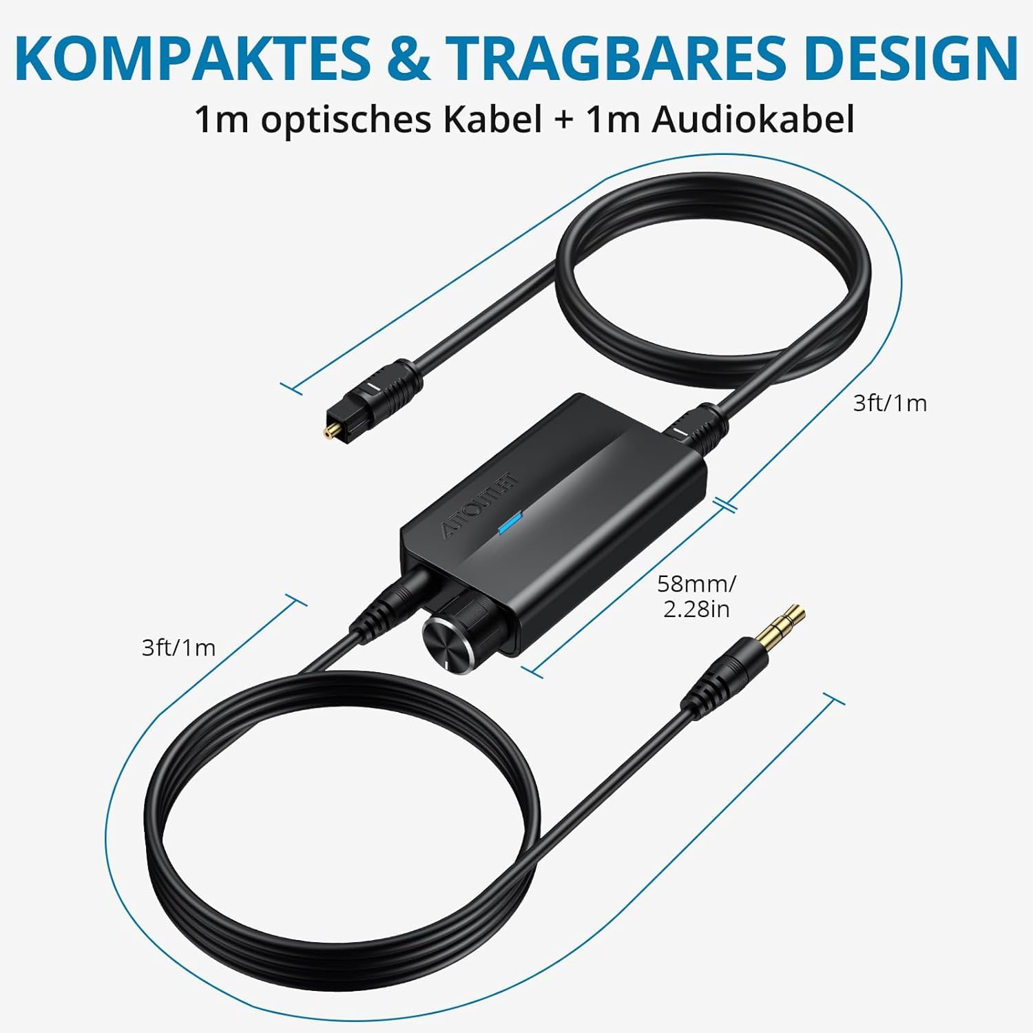 DA конвертор, 192kHz DAC конвертор, цифрово-аналогов аудио конвертор с контрол на силата на звука и 1 м подвижен 3,5 мм аудио кабел, SPDIF Toslink към 3,5 мм аналогов аудио адаптер за HDTV слушалки и игри