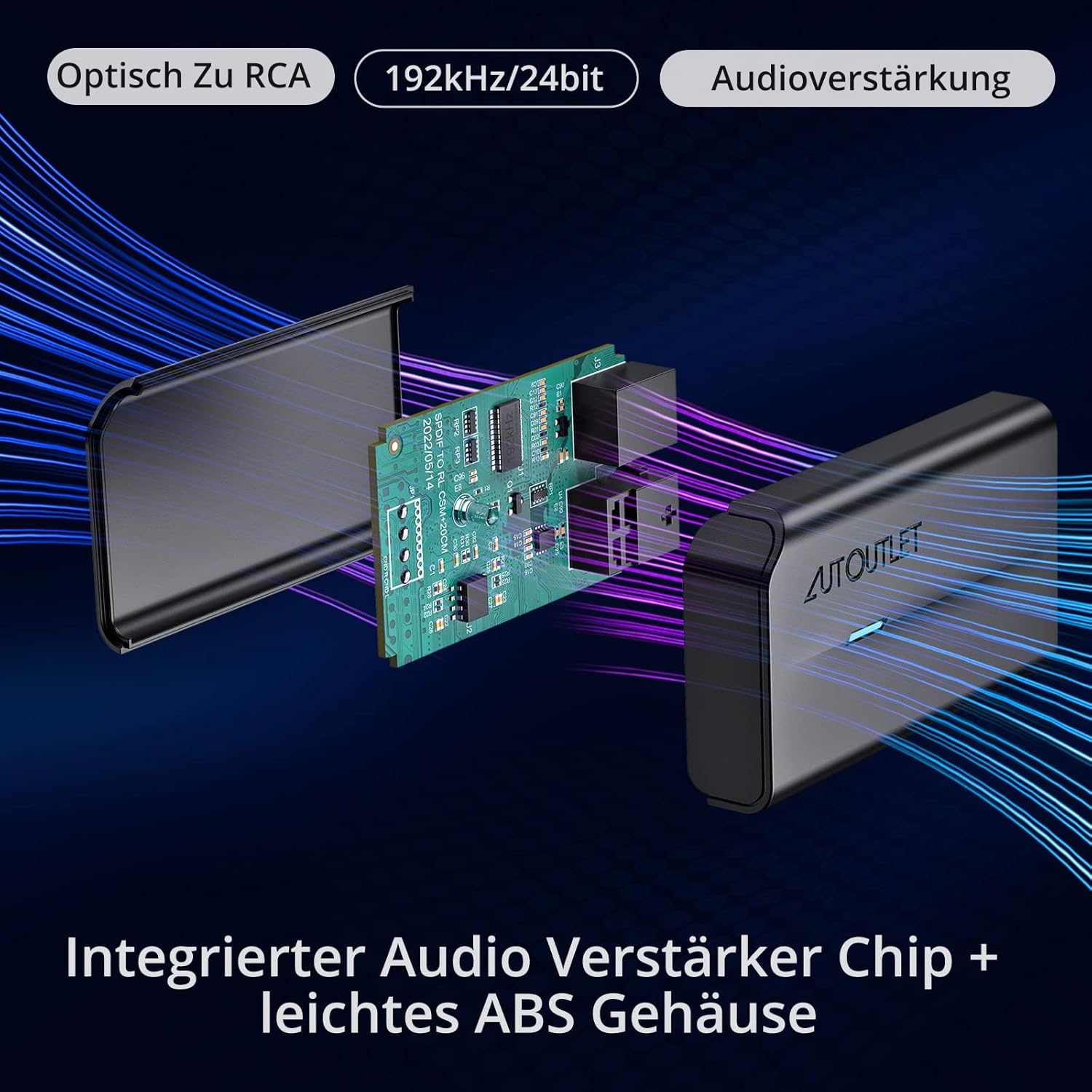 • 192 kHz цифрово-аналогов преобразувател: 192 kHz DAC е разработен за професионална обработка на аудио сигнали. AUTOUTLET 192 kHz цифрово-аналоговият преобразувател може лесно да преобразува оптичния SPDIF интерфейс в аналогов RCA аудио интерфейс за стерео усилвател.