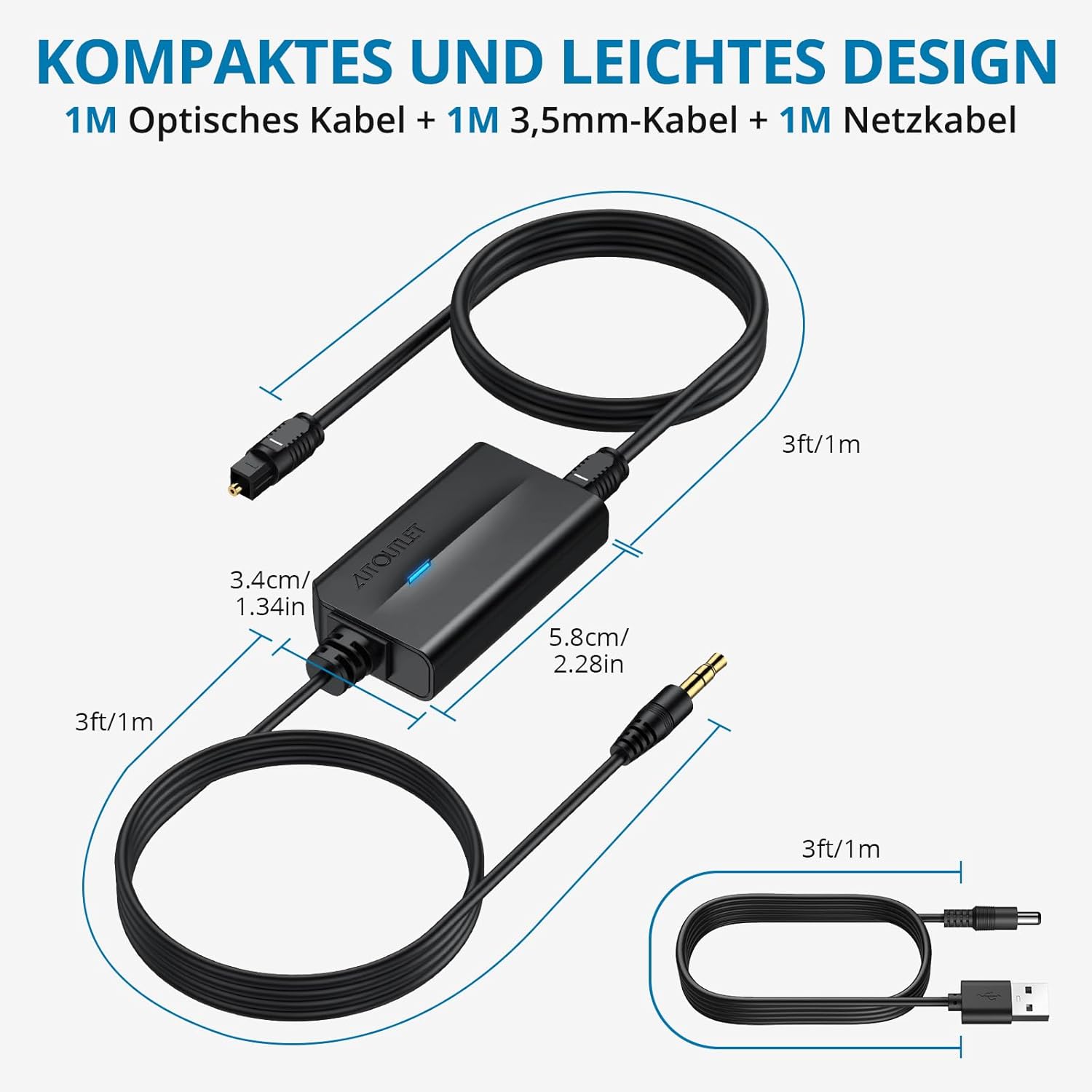 • Съдържание на пакета: пакетът съдържа 1 x 192 kHz DAC конвертор с 1 x RCA кабел мъжки (1,1 м); 1 x оптичен кабел (1 м); 1 x USB захранващ кабел и 1 x многоезично ръководство (разбира се, и на немски)