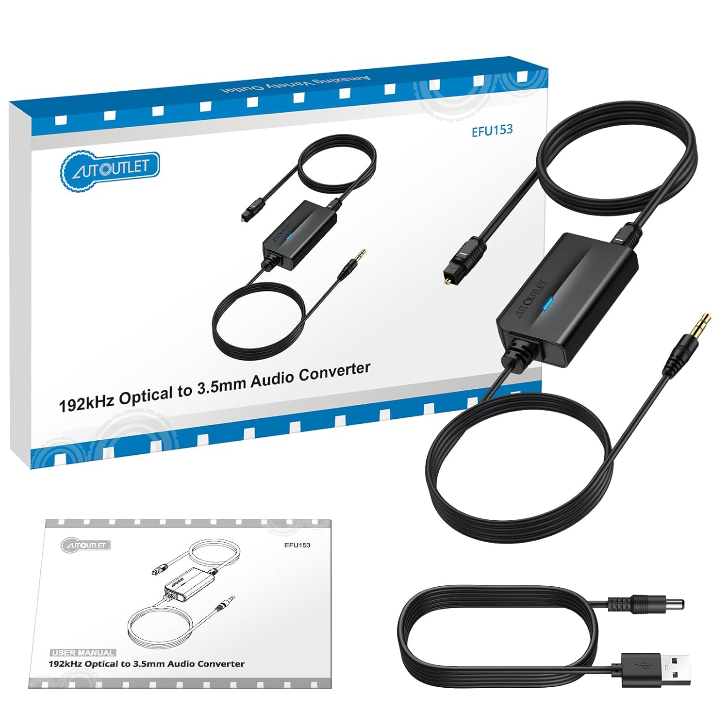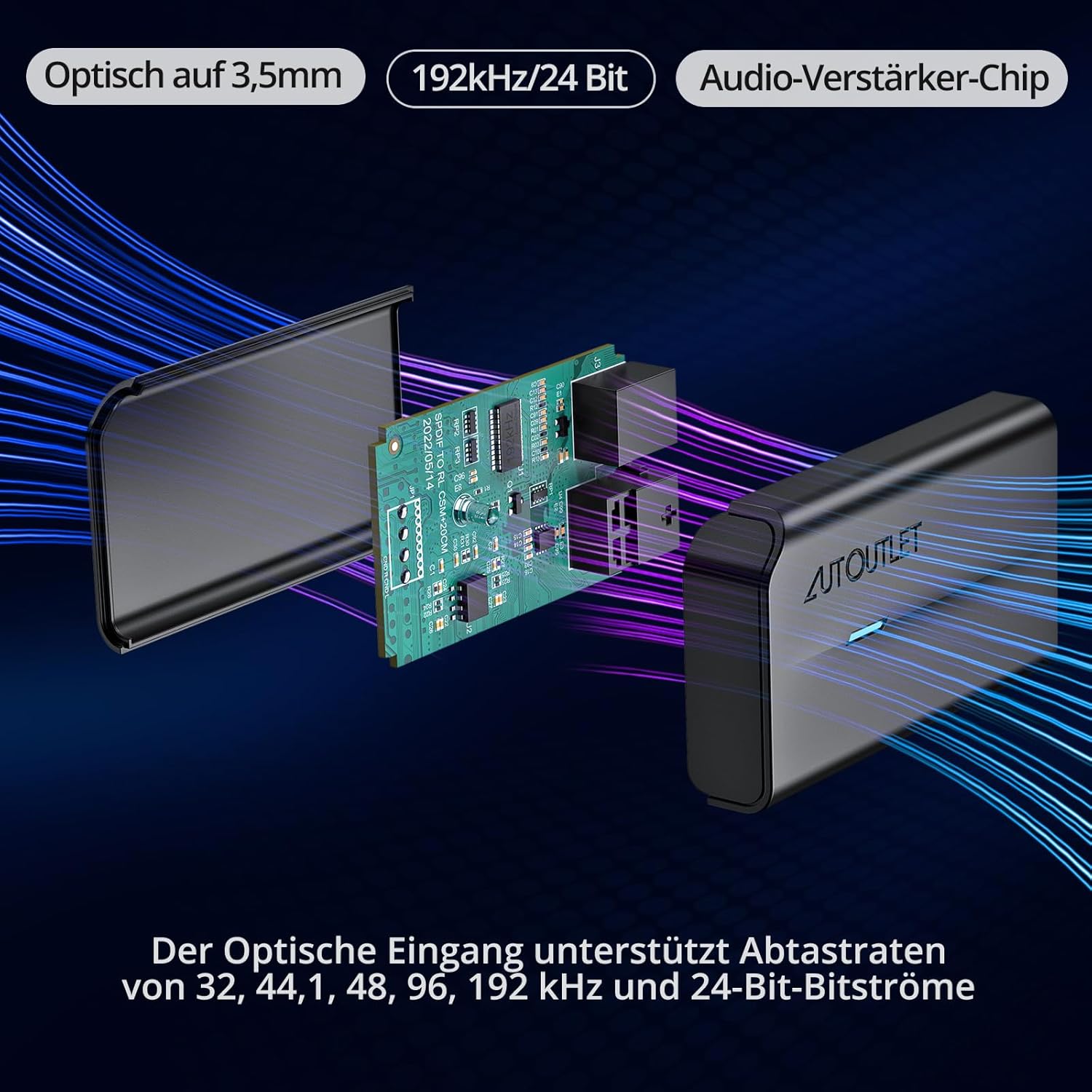 • 192 kHz цифрово-аналогов преобразувател: 192 kHz DAC е разработен за професионална обработка на аудио сигнали. AUTOUTLET 192 kHz цифрово-аналоговият преобразувател може лесно да преобразува оптичния SPDIF интерфейс в аналогов RCA аудио интерфейс за стерео усилвател.