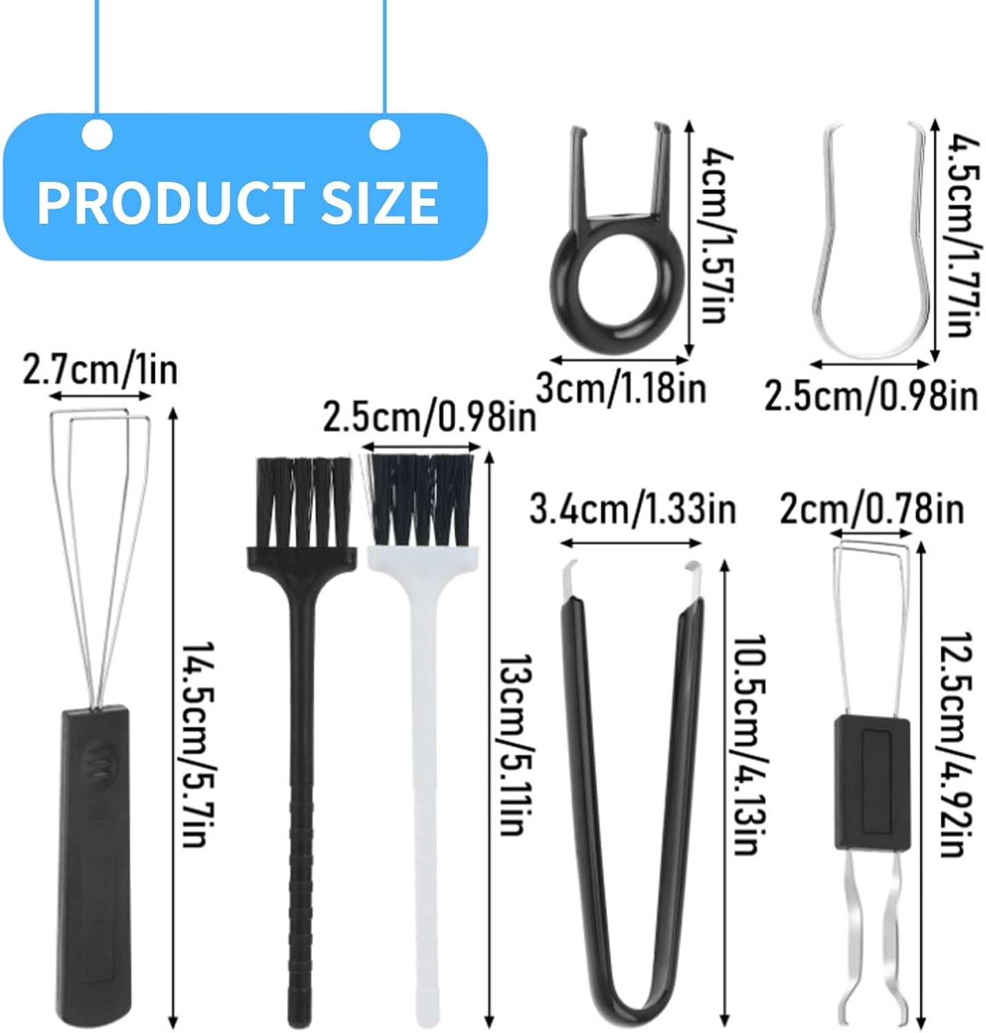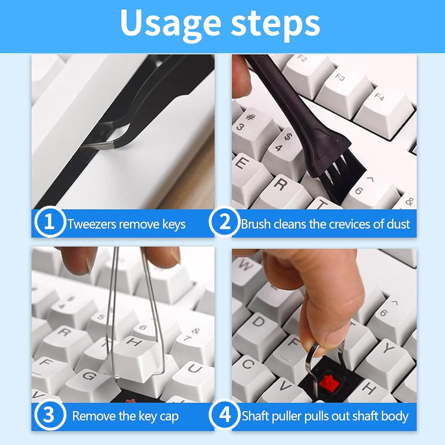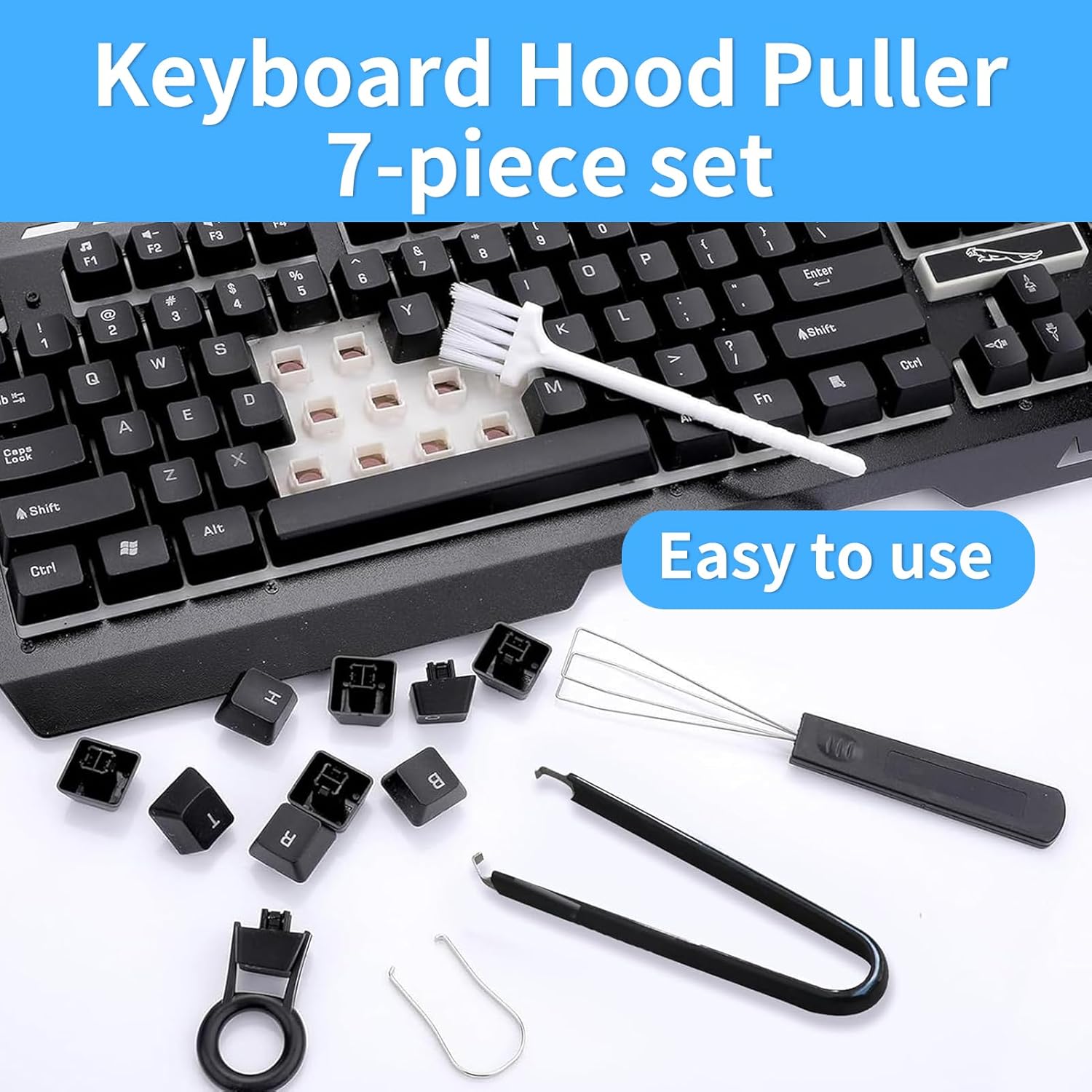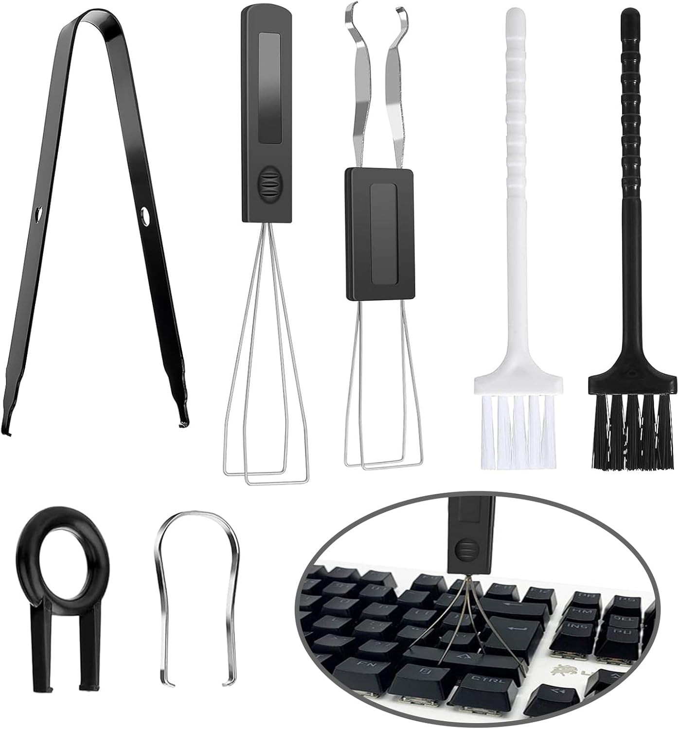 Материал: неръждаема стомана и пластмаса. Цвят: черен. Информация за продукта: Комплект от 7 инструмента за сваляне на капачки на клавиши: Този комплект инструменти за сваляне на капачки на клавиши съдържа 2 инструмента за сваляне на капачки на клавиши, 2 инструмента за превключватели, 1 пинсета и 2 четки за почистване на клавиатура. Подходящи за ежедневна употреба. Висококачествени материали: нашият инструмент за сваляне на бутони на клавиатура е изработен от висококачествена неръждаема стомана и пластмаса. Те са издръжливи и лесни за употреба. Два инструмента за сваляне на капачки на клавиши и превключватели, така че можете да изберете най-добрия вариант. Лесен за употреба: Нашият инструмент за сваляне на превключватели е лесен за употреба. Той пасва перфектно на капачки на клавишите и се свалят лесно. След това почистете старателно с четка за клавиатура. Перфектният аксесоар за почистване на клавиатура! Ефективно почистване: Почистването на клавиатурата често се пренебрегва, въпреки че под клавишите може да се натрупа много мръсотия. След като използвате нашия инструмент за сваляне на капачки на клавиши, можете да почистите клавиатурата си удобно и бързо с четката за почистване. Широко използван: нашият инструмент за сваляне на капачки на клавиши е съвместим с повечето механични клавиатури. Подходящ за почистване на лаптопи, механични клавиатури, настолни компютри, лаптопи, екрани и електронни устройства и др.