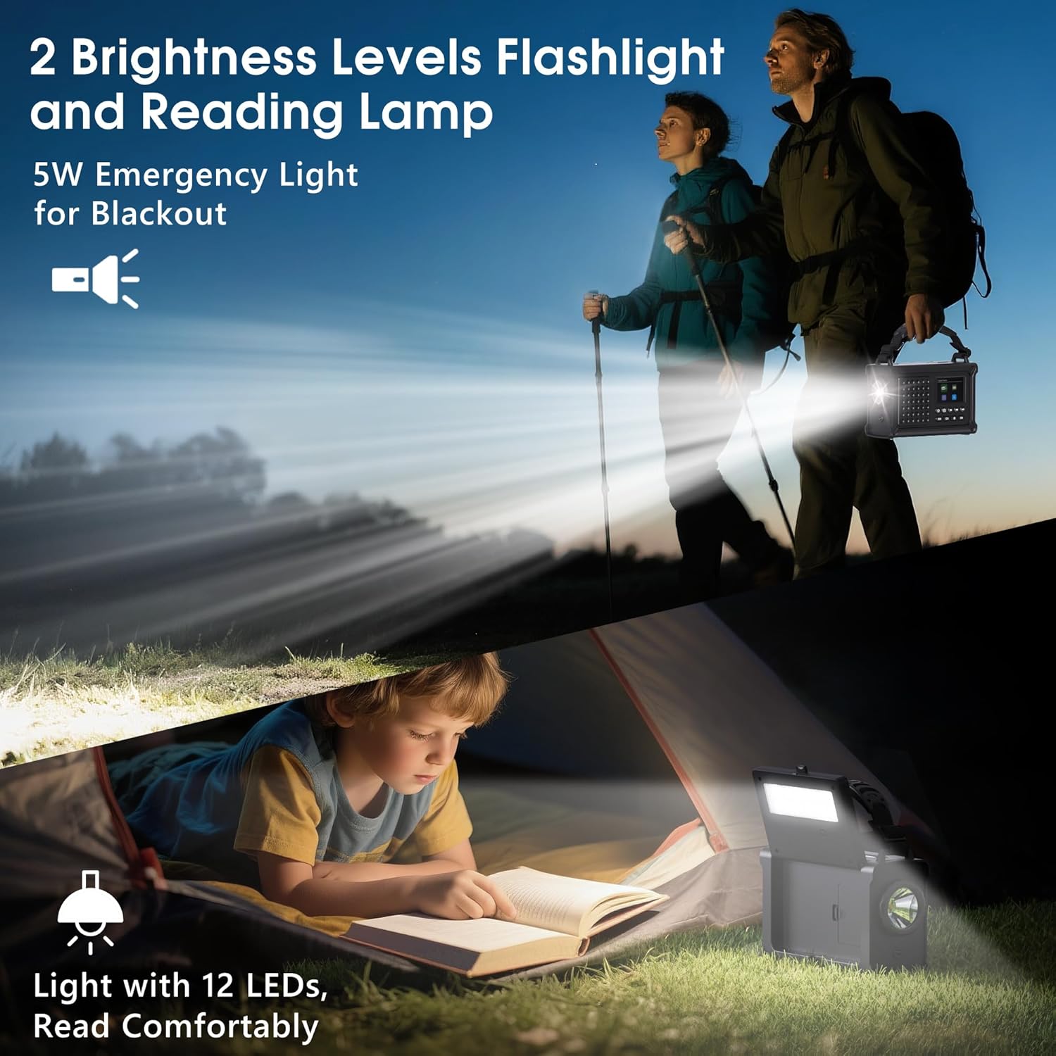 • Многофункционално преносимо радио: вграденото фенерче и регулируемата лампа за четене са идеални за осветление в тъмното. Те предлагат две нива на яркост (високо и нормално). Лампата за четене е с регулируем ъгъл, за да улесни четенето през нощта. С 12 LED светлини, осветлението е приятно за очите. В случай на спешност, бутонът "SOS" активира мигаща аларма, за да привлече вниманието. Това аварийно радио е идеално за туризъм, къмпинг, прекъсване на електрозахранването и аварийни ситуации.