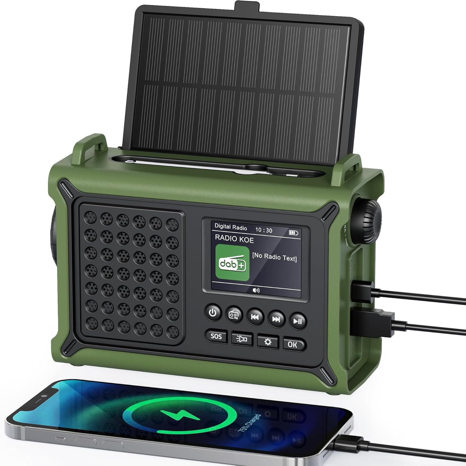 DAB Plus радио, FM цифрово радио, слънчево аварийно радио с батерия 12000 mAh, акумулаторно, манивела с функция за зареждане на мобилен телефон през USB, 80 предварително зададени станции, цветен дисплей, радиостанции с Bluetooth за...