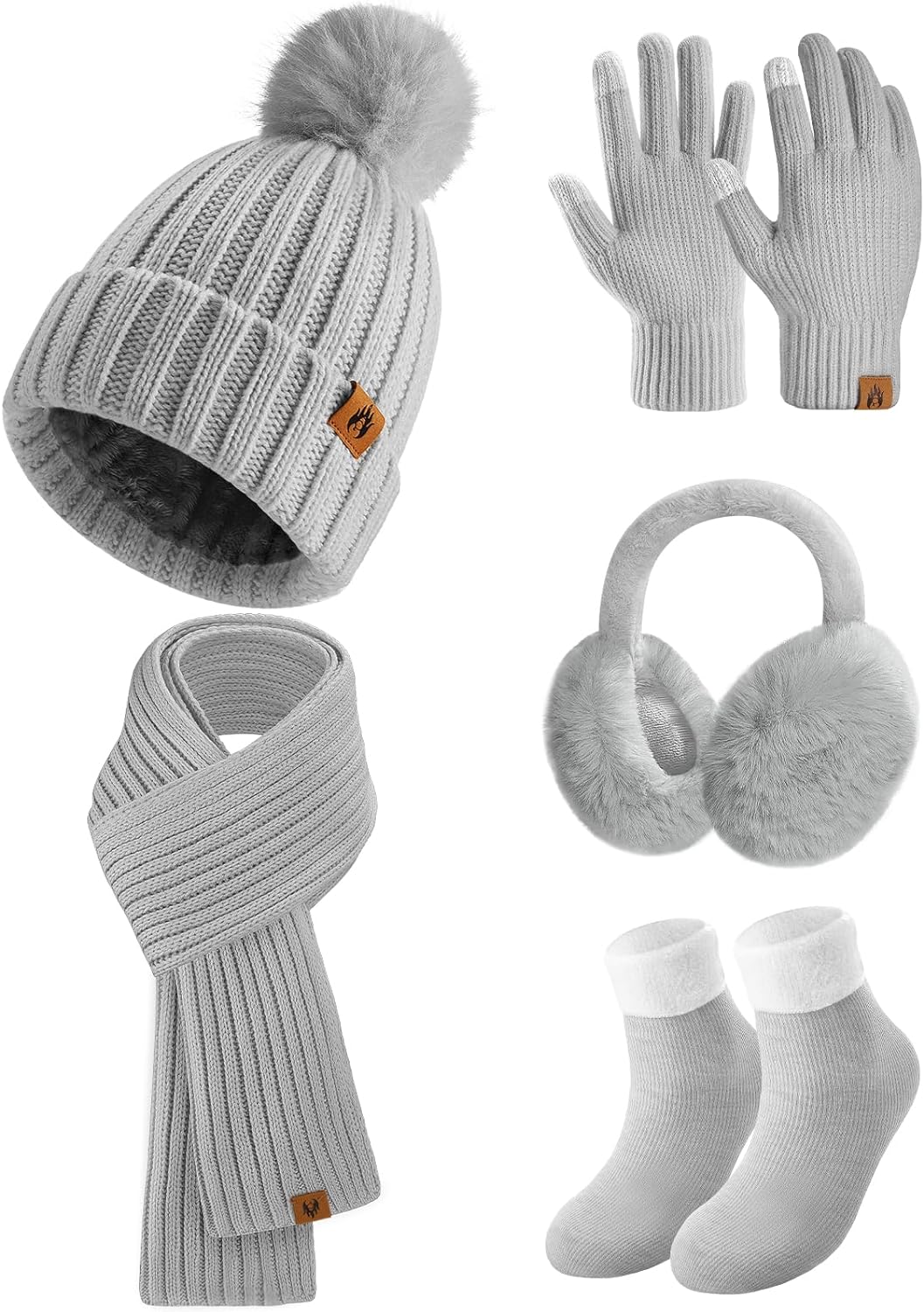 Дамски комплект за студено време Niwicee, Висококачествена изработка, Зимна шапка, ушанки, шал, ръкавици и чорапи, Сив