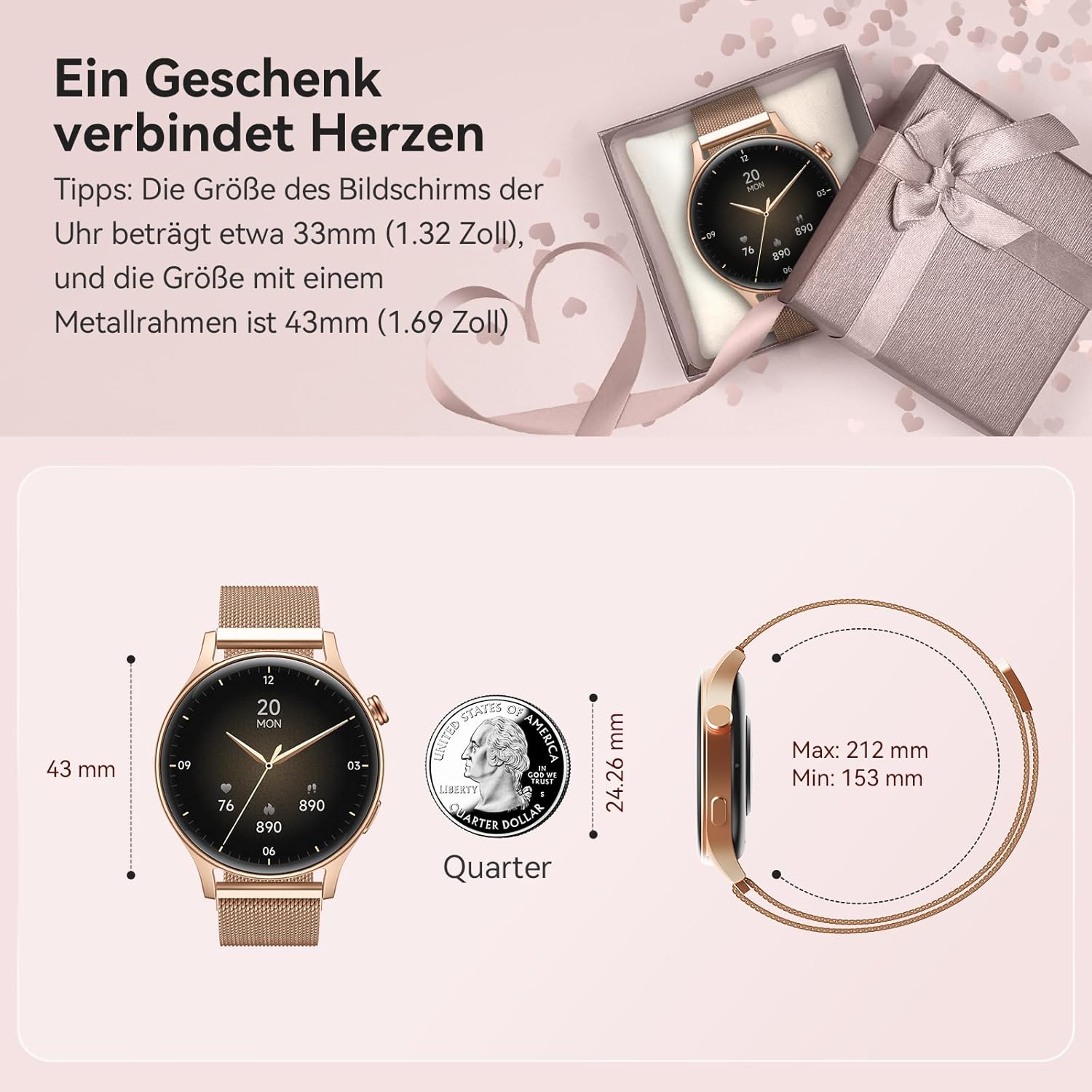 • Стилен дизайн за жени: с 1,32-инчов AOMLED екран и метални ръбове, смарт часовникът ви предлага ясно и ярко цветопредаване и отлично потребителско изживяване, особено за жени и мъже, които са приоритет за модата и фитнеса. Съвети: размерът на екрана на часовника е около 33 мм (1,32 инча), а размерът с метална рамка е 43 мм (1,69 инча). Общото тегло на часовника е приблизително 50,64 г.