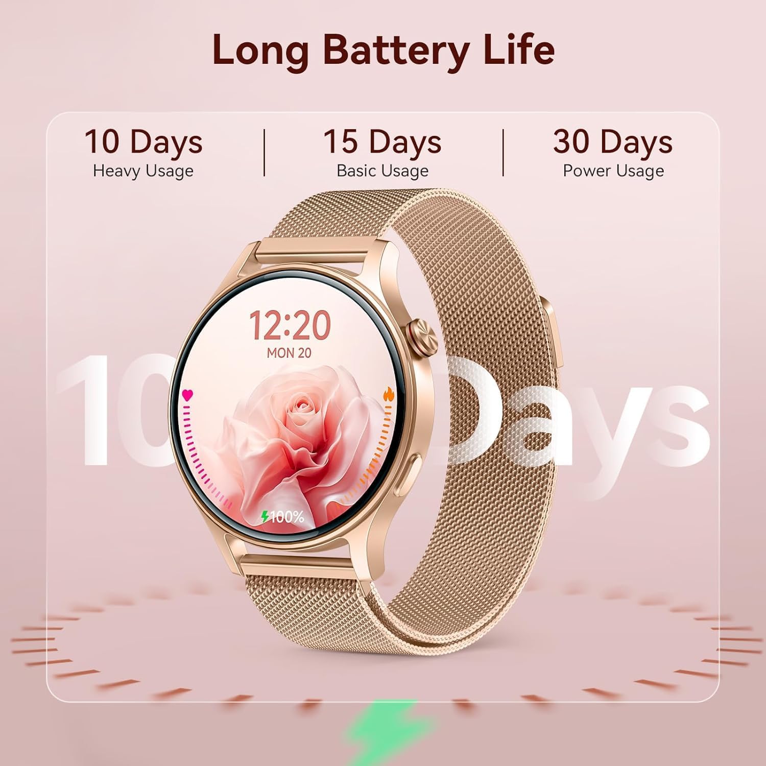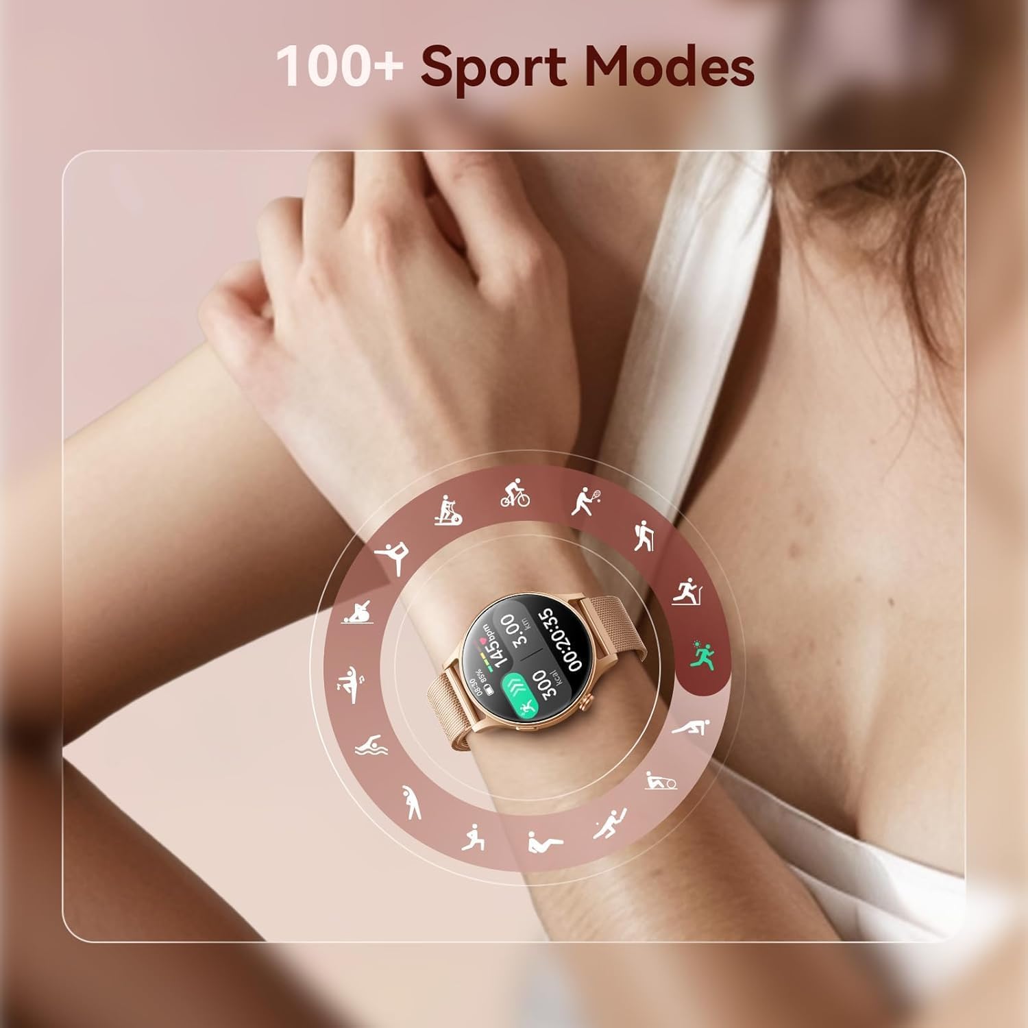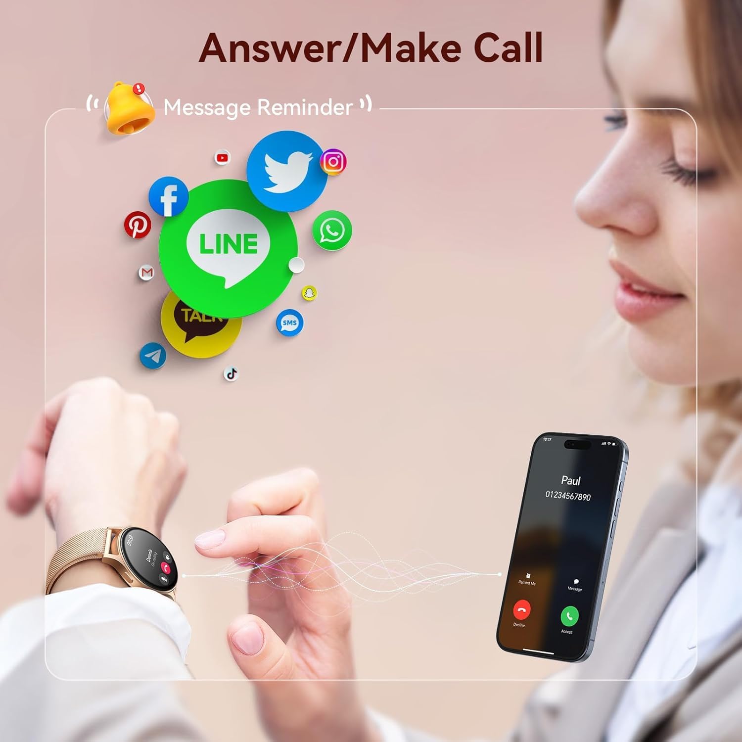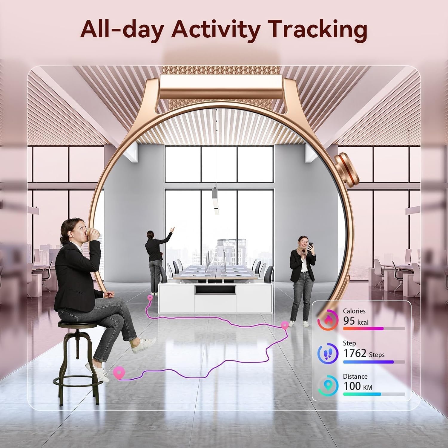 Дамски кръгъл смарт часовник aeac с функция за телефон, AMOLED ултра ясен екран за жени (диаметър 43 мм), 110+ спортни режима, SpO2 монитор за пулс, монитор за сън, 3ATM водоустойчивост, фитнес