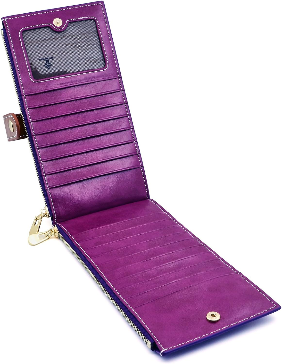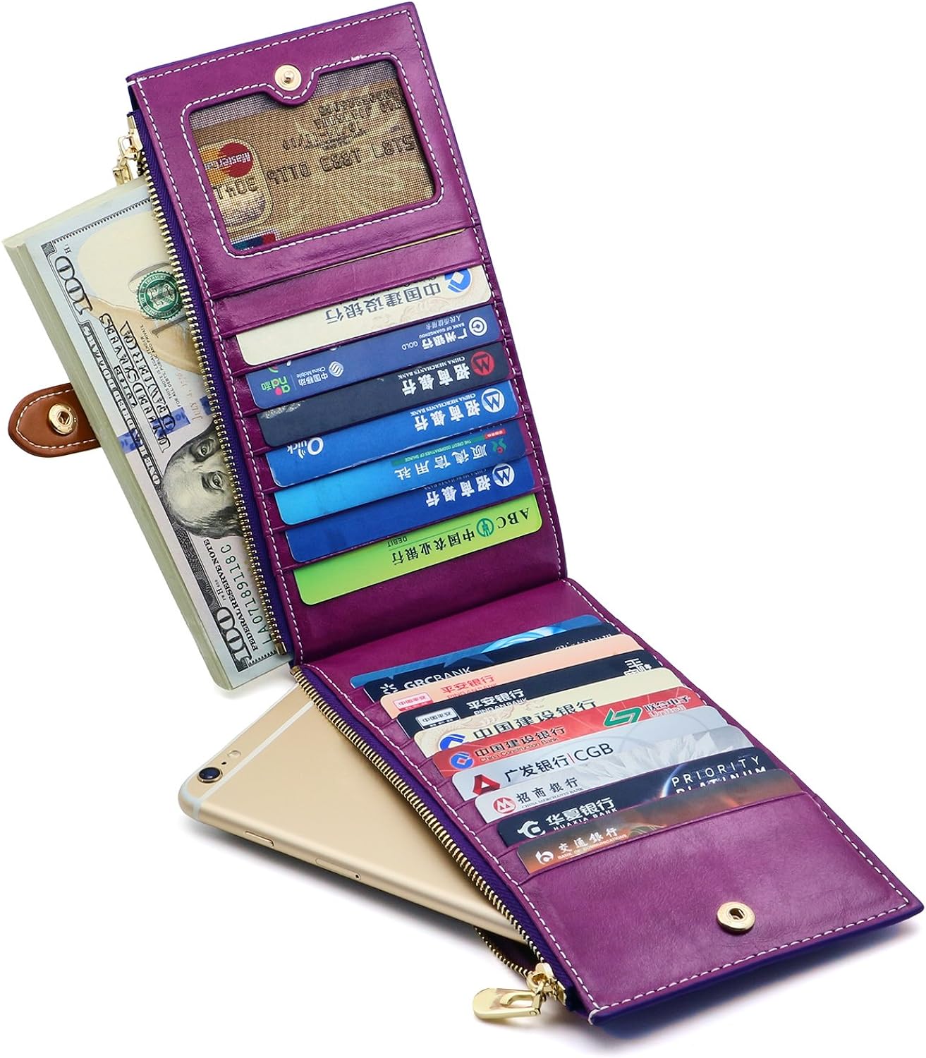 • Голям капацитет: 17 слота за карти, 1 държач за лична карта и 2 джоба с цип. Вашите разписки, документи за самоличност, карти и пари в брой могат да бъдат добре организирани в този мощен портфейл. Можете също така да поставите мобилния си телефон (побиращ до iPhone 8 plus) в тези 2 джоба с цип.
