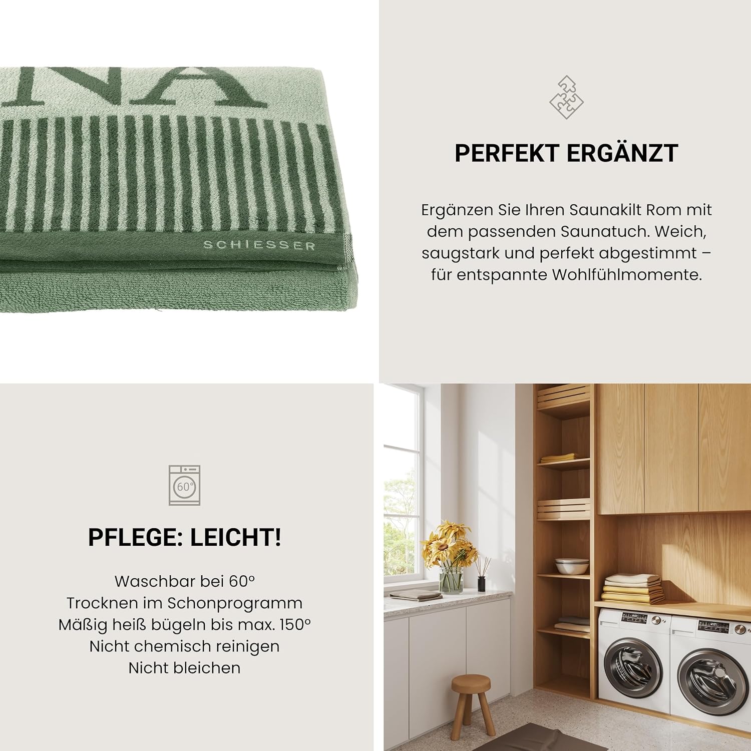 Напред към сауната. Задоволете копнежа си за почивка с колекцията за сауна Schiesser Rome. Помислете за красиви, абсорбиращи сауна килтове и големи, меки кърпи за сауна, които са перфектно съчетани. Време е за релакс.