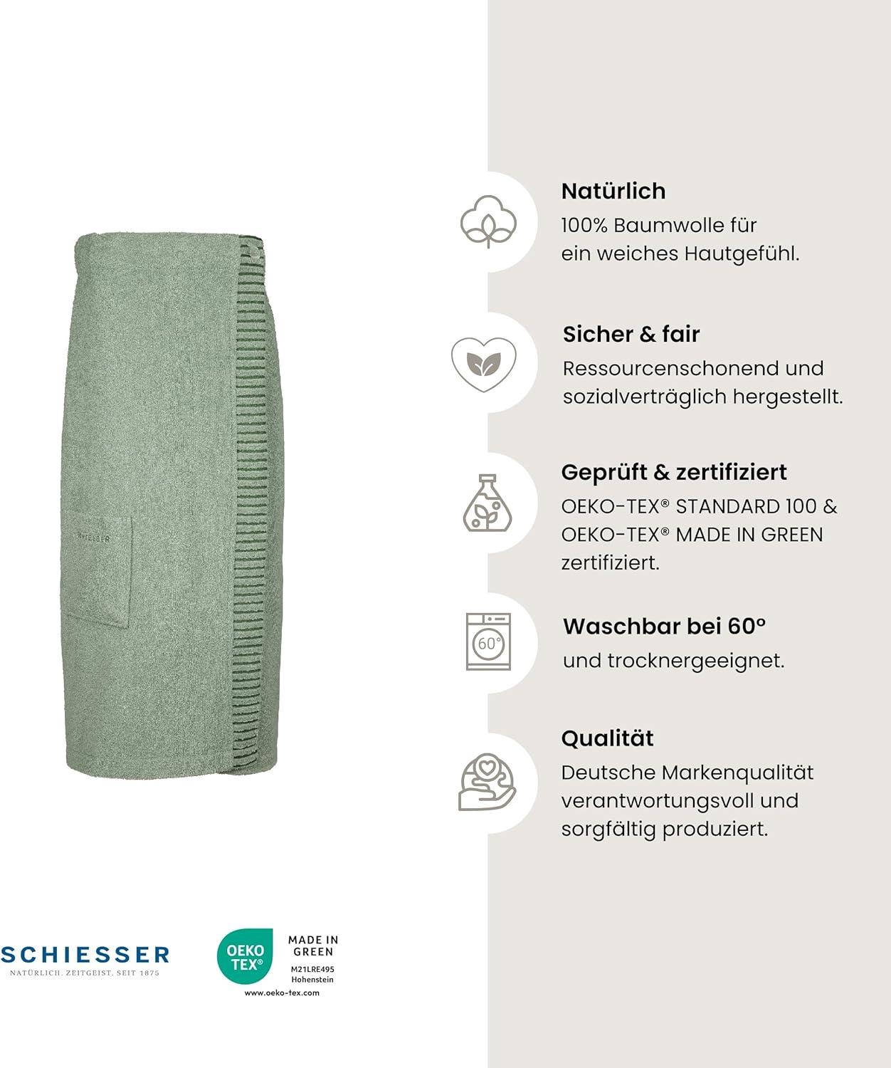 Висококачествен сауна килт със сложни детайли. 100% памук от устойчиво производство. Мек и абсорбиращ. Известно качество на марката Schiesser. Щадлив към кожата, лесен за почистване и сушене. 3-посочно индивидуално регулиране на ширината. Джоб за ръка с бродирано лого. 2 размера Подходящ за хора с алергии. Без вредни вещества. Безопасен и справедливо произведен.