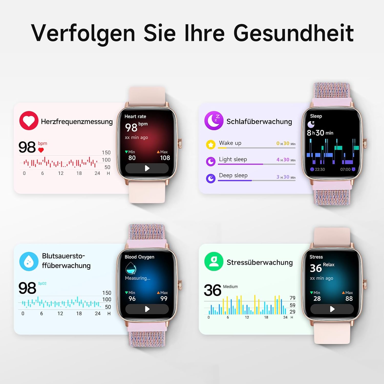 • 24/7 наблюдение на здравето: дамският фитнес часовник следи здравето ви 24/7 с усъвършенствани сензори. Следете сърдечната честота, кислорода в кръвта, фазите на съня, нивата на стрес и други, за да ви помогне да изберете по-здравословен начин на живот.