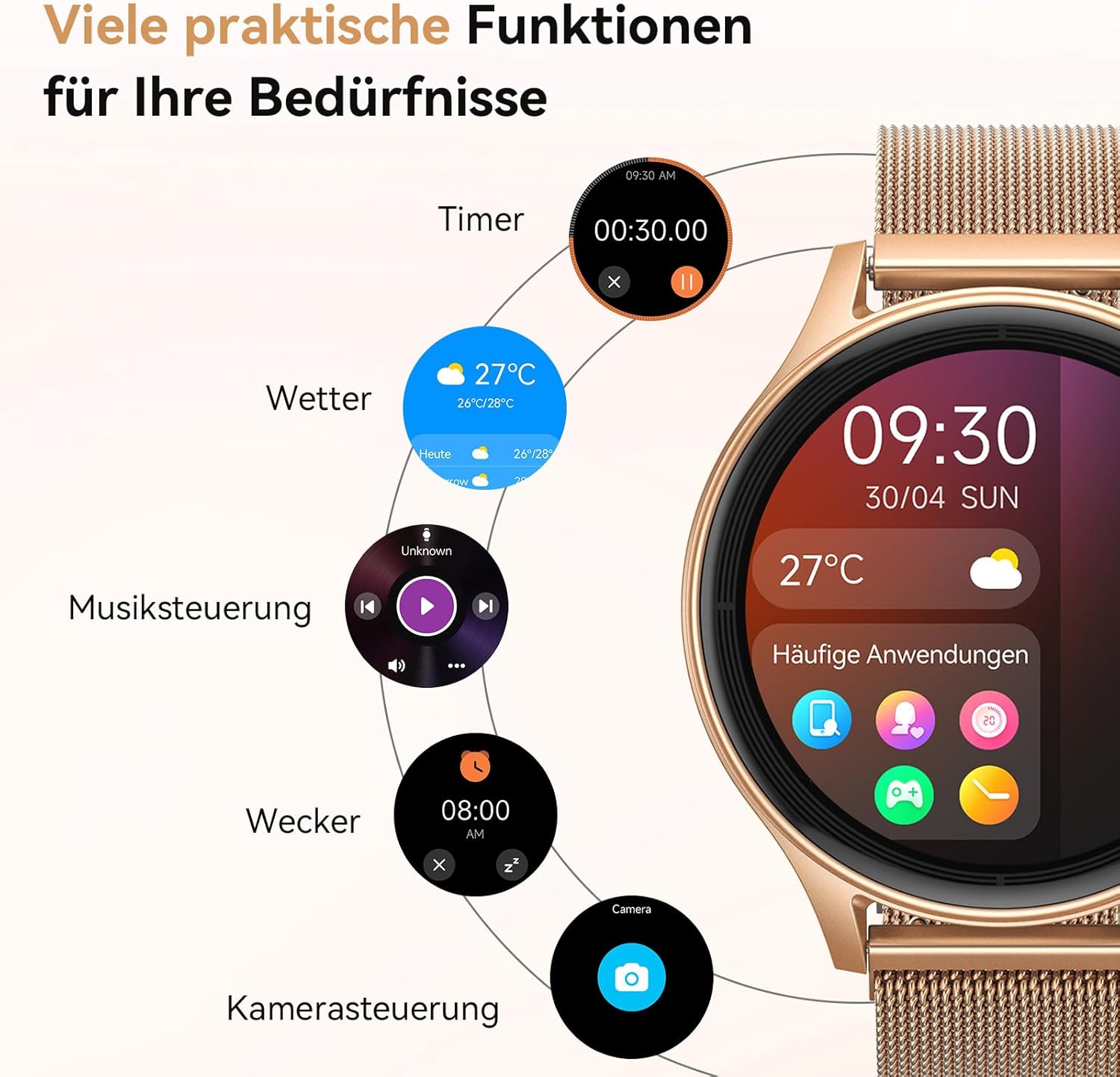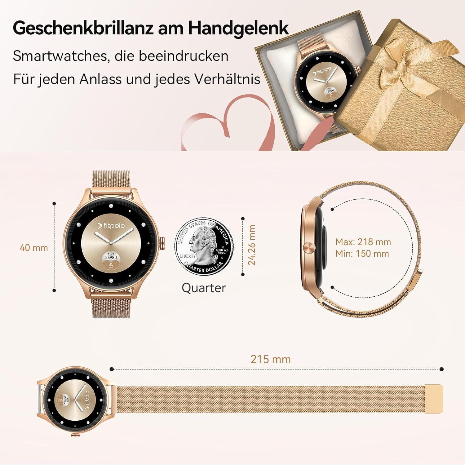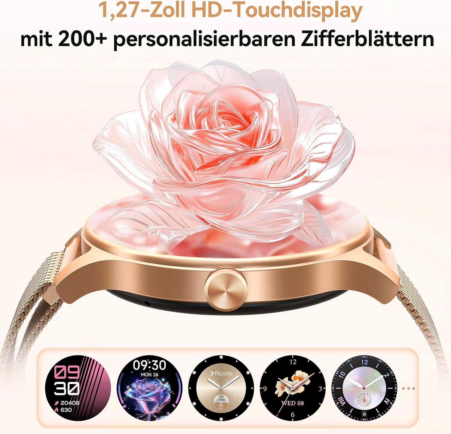 • AMOLED дисплей със стилен дизайн: Дамският смарт часовник Fitpolo впечатлява с 40 мм AMOLED екран, който предлага живи цветове и перфектна четливост дори на пряка слънчева светлина. Кръглият метален корпус съчетава елегантност със здравина - плюс смарт часовник с над 200 персонализирани циферблата или любимата ви снимка за вашия индивидуален външен вид. (Активна площ на дисплея: 1,27 инча)