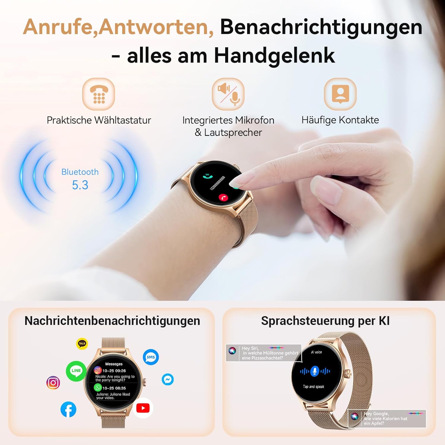 • Интелигентни известия и гласово управление с изкуствен интелект: този дамски смарт часовник с вграден високоговорител ви позволява да осъществявате или да отговаряте на повиквания чрез часовника, след като се свържете с Bluetooth. Дамският часовник показва известия за SMS, WhatsApp, Facebook, Instagram, TikTok, LinkedIn и други приложения за съобщения. Можете също да използвате Google Assistant или Siri чрез гласова команда - идеално за в движение или по време на спорт.