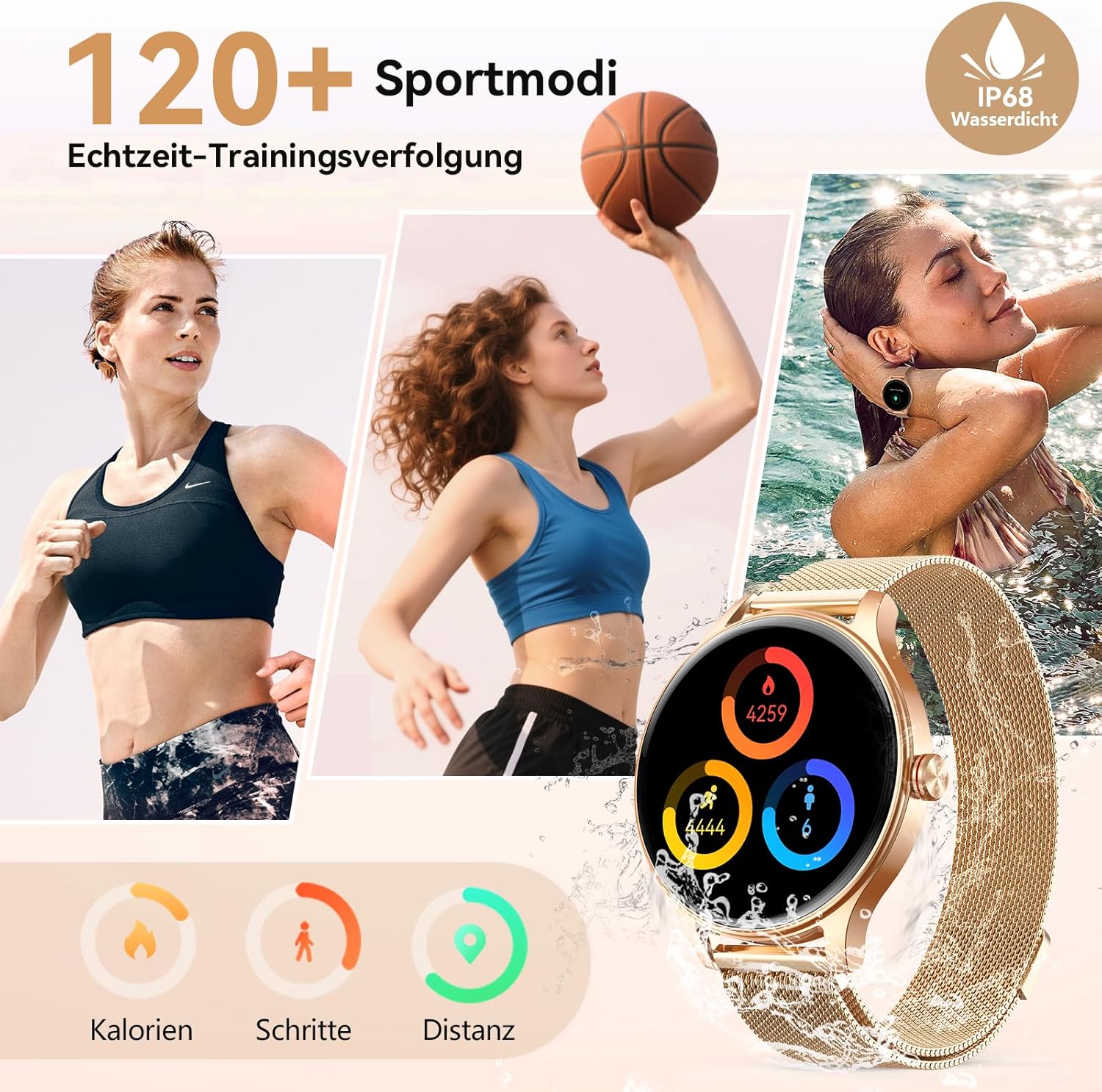 • 120+ спортни режима и водоустойчивост IP68: този дамски часовник предлага над 200+ спортни профила за дейности на закрито и открито (бягане, футбол, колоездене, йога и др.) и записва прецизни стъпки, разстояние, разход на калории. Мъжкият смарт часовник е водоустойчив с 5ATM и IP68 сертификат - идеален за дъжд, изпотяване и водни спортове.