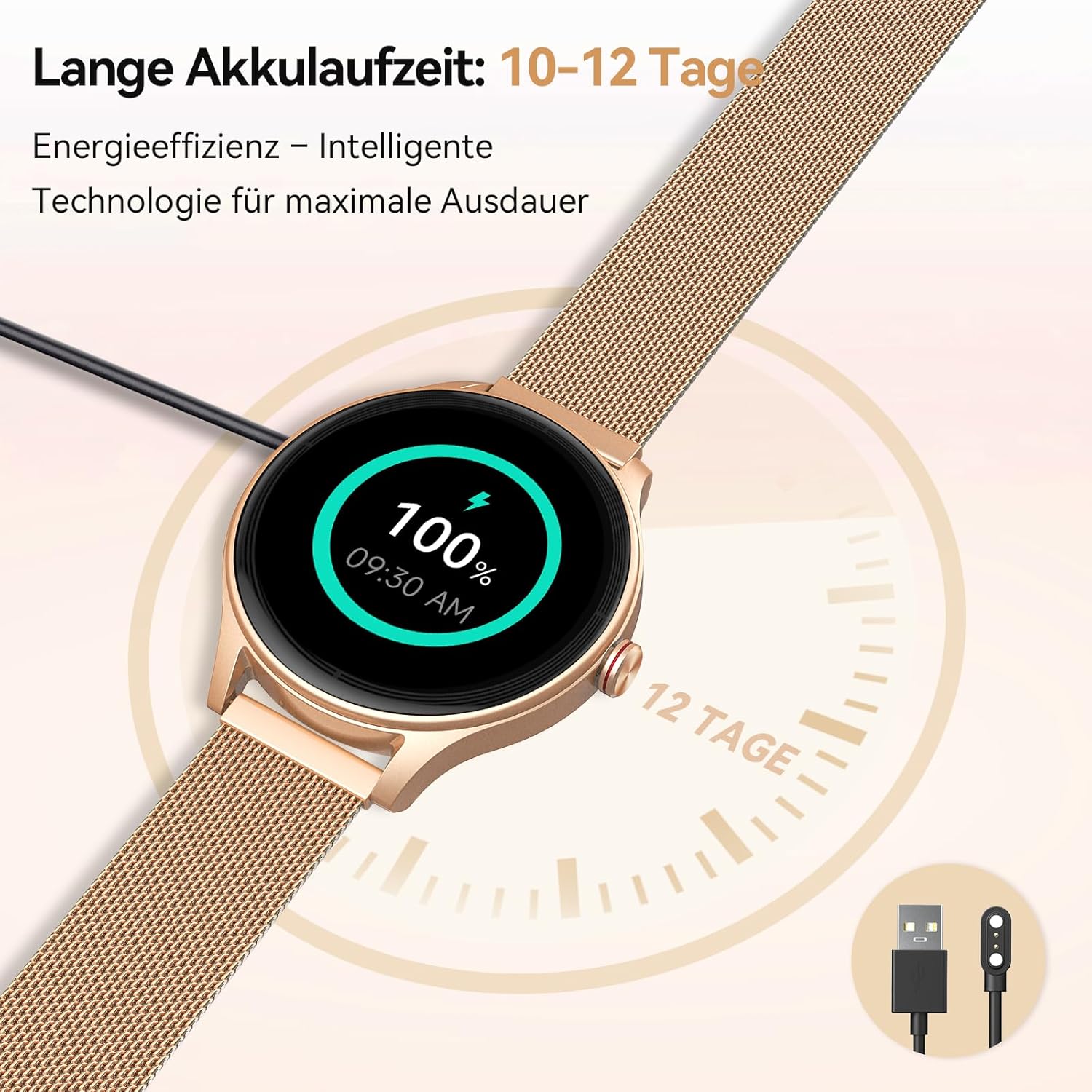 • 12-дневна батерия и широка съвместимост: дамският фитнес часовник има мощна батерия и икономичен процесор, които издържат до 12 дни при ежедневна употреба. Интелигентният режим за пестене на енергия позволява дори 30 дни в режим на готовност. Дамският смарт часовник с функция за телефон е съвместим със смартфони (iOS и Android) - идеалният подарък за спортни и технологични ентусиасти.