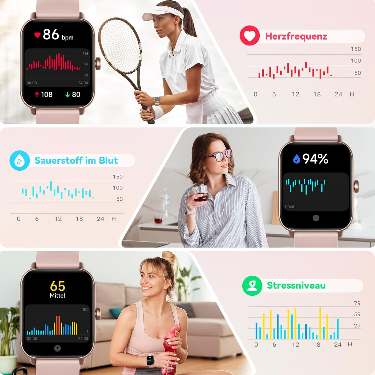 • 24-часово наблюдение на здравето: Оборудван с мощни оптични сензори, смарт часовникът поема прецизен контрол над вашето здраве, като записва стъпки, разстояние, калории и следи сърдечната честота, кислорода в кръвта, нивото на стрес и състоянието на съня. Фитнес часовникът анализира всички тези данни и ви напомня за състоянието на тялото на китката ви и ви предлага съвети за по-здравословен начин на живот.