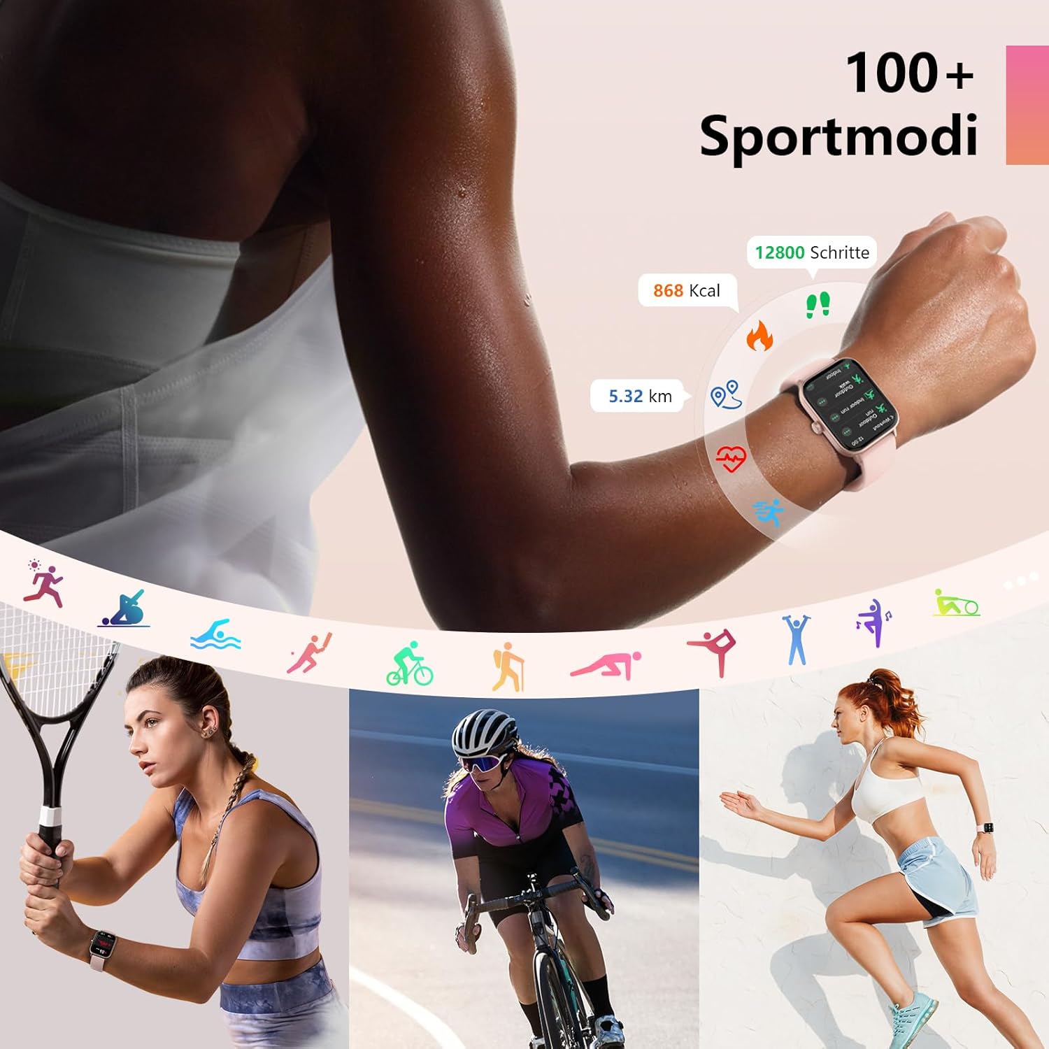 • 1,8-инчов ясен екран и DIY циферблати: Насладете се на тънък и ултра ясен изцяло сензорен екран, спортният часовник ви предлага високо качество на цветовете и чувствителност на допир, което улеснява използването на различни функции. Дамският смарт часовник има повече от 100 циферблата, от които можете да избирате от приложението "VeryFit", а също така поддържа DIY циферблати, така че можете да регулирате циферблата с любимите си снимки.