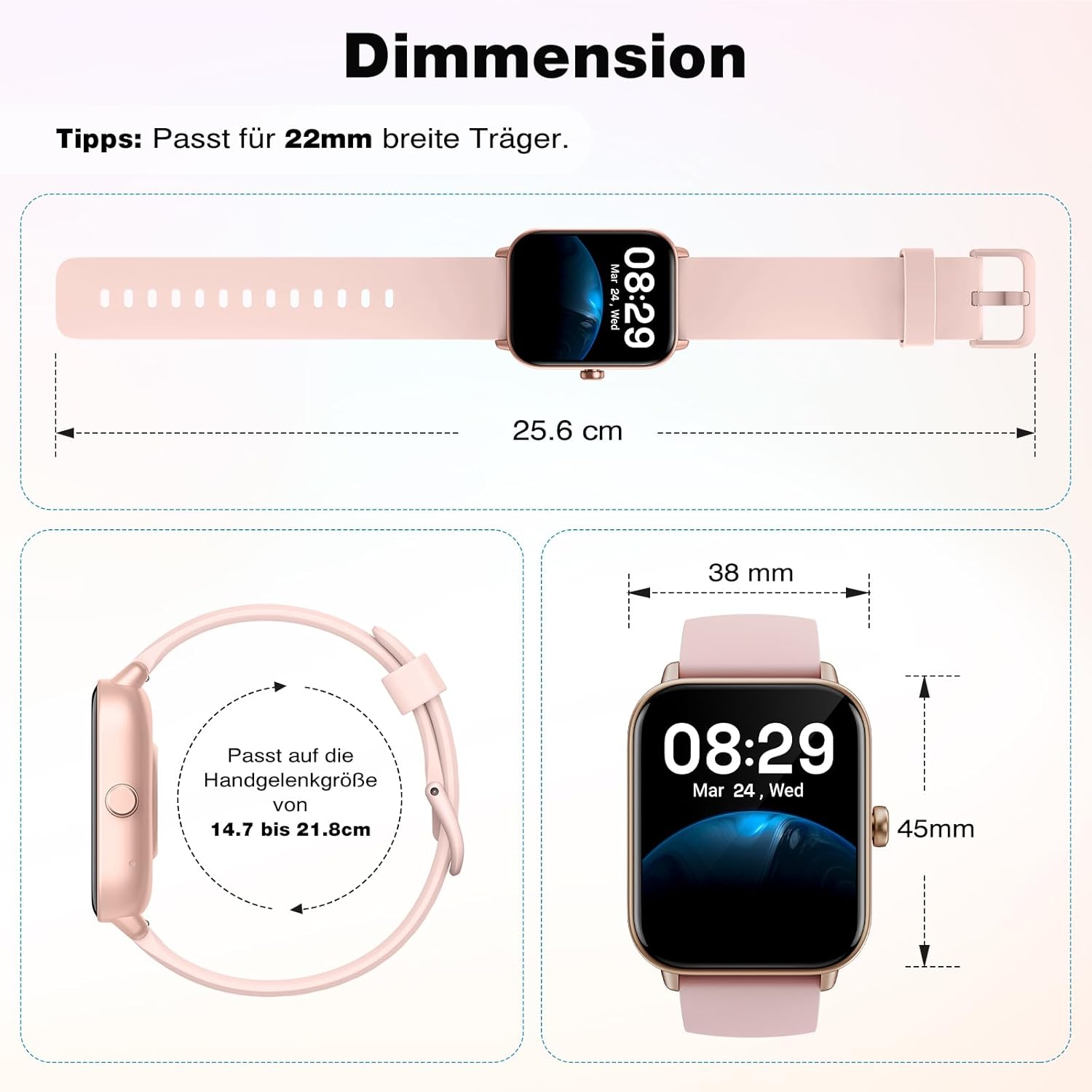 • Дълъг живот на батерията и други функции: използвайки най-новите технологии, дамският смарт часовник е оборудван с батерия с голям капацитет и ниска консумация на енергия, което ви позволява да го заредите напълно за седем дни нормална употреба с 2,5 часа. Смарт часовникът с Android има и много други функции, като будилник, управление на музика и камера, прогноза за времето, проследяване на менструалния цикъл и др.