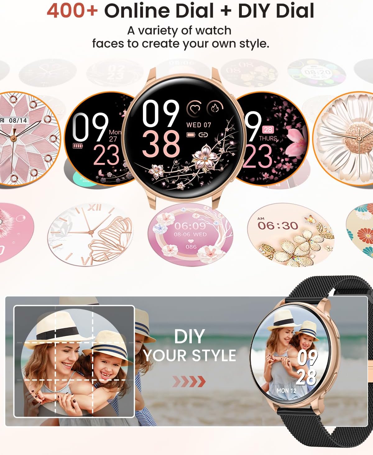 • Универсални циферблати - Практични и стилни в движение: Дамският смарт часовник предлага над 400 онлайн циферблата, както и персонализируеми DIY дизайни, така че можете да промените стила си по всяко време и да покажете уникалния си вкус. Поддържа немски като системен език, както и заявки за времето, управление на музика, настройки на будилника, гласови асистенти и SOS спешно повикване. Независимо дали сте в ежедневието или при спешни случаи, този смарт часовник ви предлага комфортно и интелигентно изживяване.