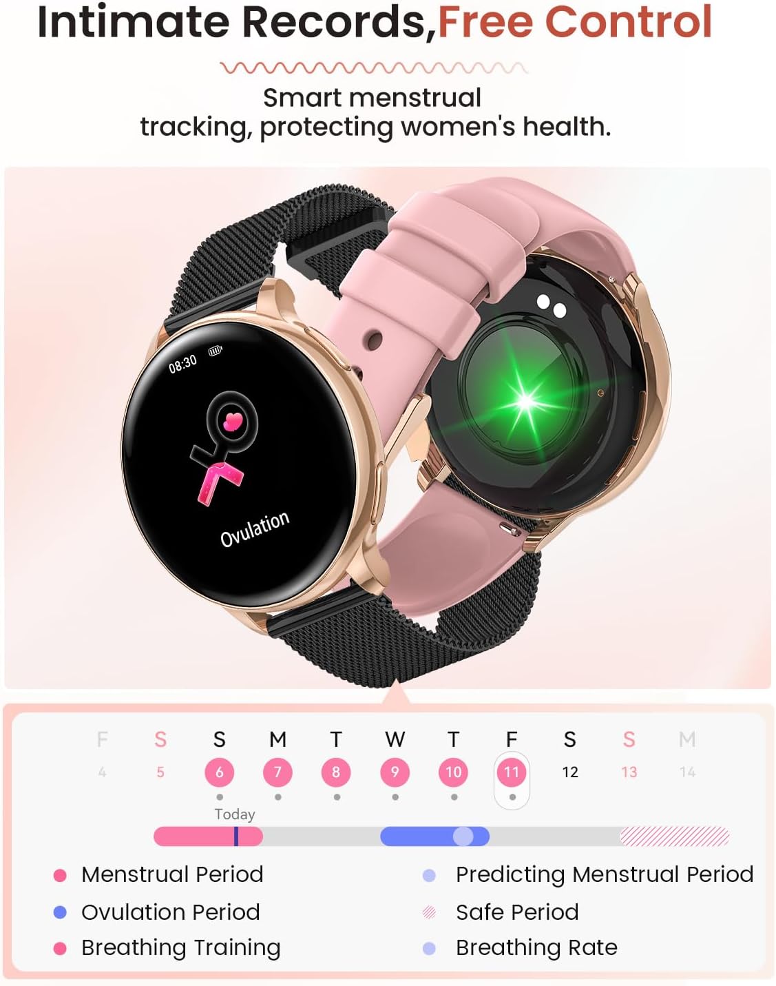 • Характеристики за жени - Нежна и внимателна грижа: Този дамски смарт часовник е специално проектиран за жени и има интелигентна функция за проследяване на цикъла, която ви помага точно да проследявате менструалния си цикъл, както и да прогнозирате менструацията и овулацията. В същото време функцията за дихателни упражнения подпомага релаксацията ви и помага за облекчаване на стреса. Дамските часовници ви позволяват да живеете по-здравословен и безгрижен живот.