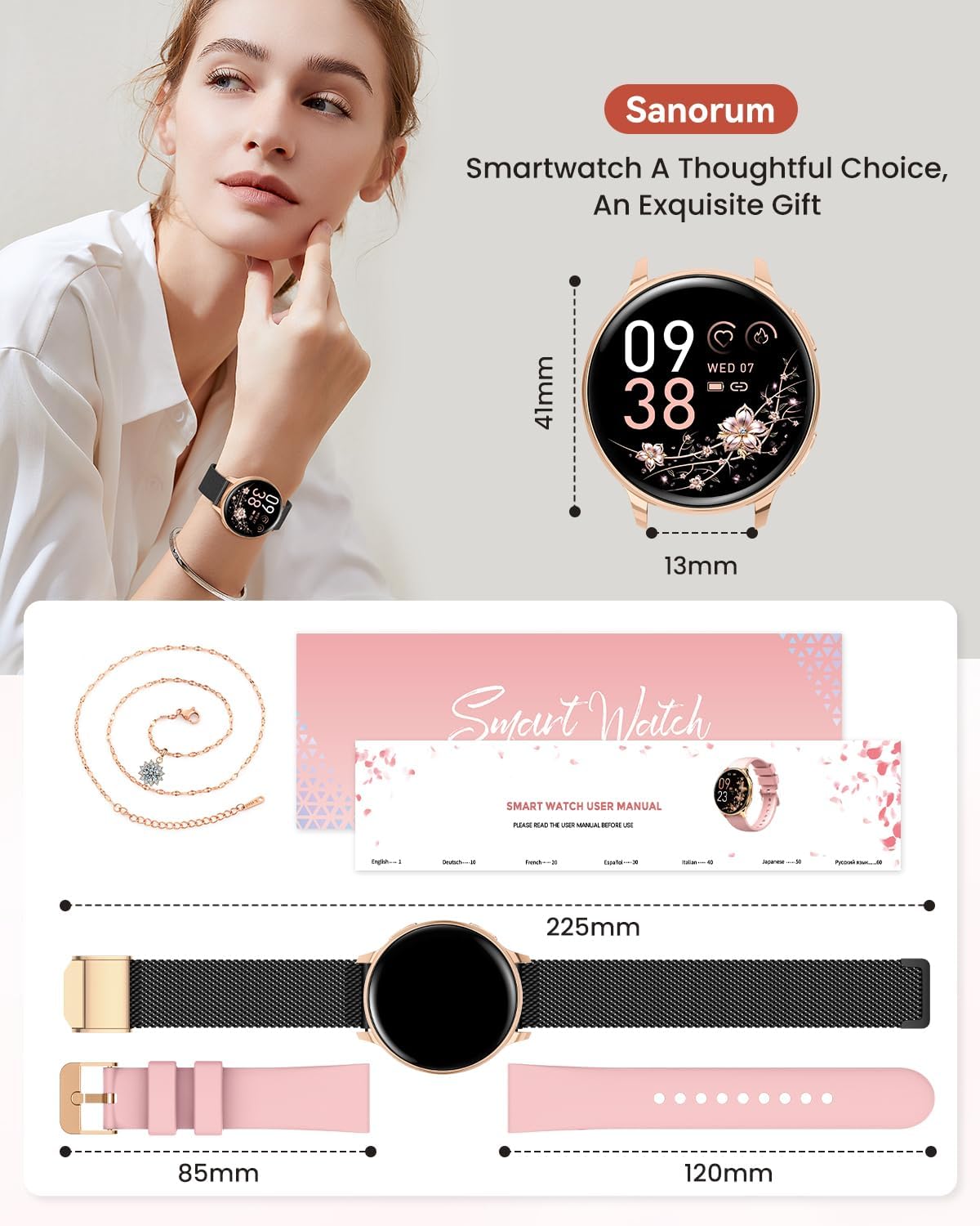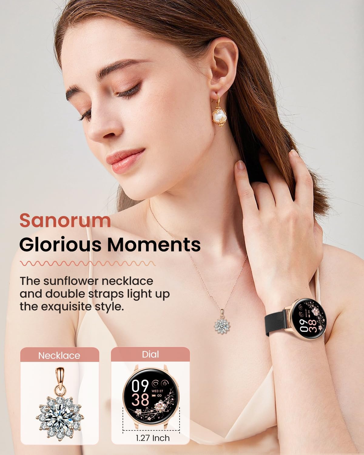 • Елегантен и модерен дизайн - в хармония с класиката: Дамският смарт часовник Sanorum впечатлява с елегантен и модерен дизайн. Специално съчетан с деликатните аксесоари, които внасят нотка на природа и елегантност във врата ви. Две сменяеми гривни осигуряват повече възможности за стилизиране за различни поводи, така че да блестите с грация по всяко време и да бъдете център на вниманието.