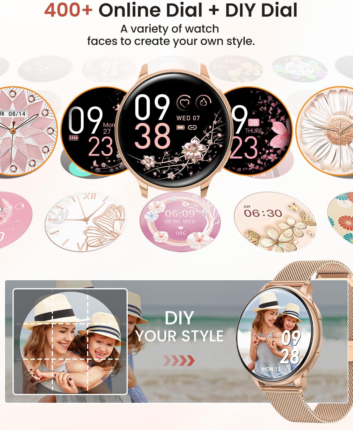 • Универсални циферблати - Практични и стилни в движение: Дамският смарт часовник предлага над 400 онлайн циферблата, както и персонализируеми DIY дизайни, така че можете да промените стила си по всяко време и да покажете уникалния си вкус. Поддържа немски като системен език, както и заявки за времето, управление на музика, настройки на будилника, гласови асистенти и SOS спешно повикване. Независимо дали сте в ежедневието или при спешни случаи, този смарт часовник ви предлага комфортно и интелигентно изживяване.