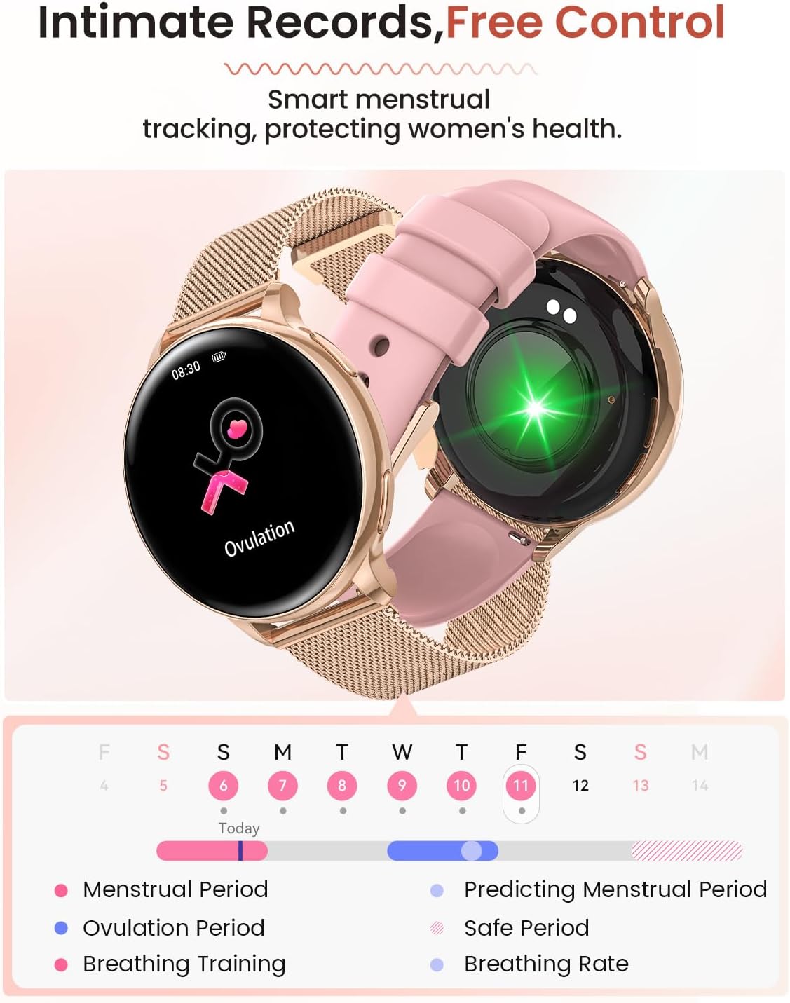 • Характеристики за жени - Нежна и внимателна грижа: Този дамски смарт часовник е специално проектиран за жени и има интелигентна функция за проследяване на цикъла, която ви помага точно да проследявате менструалния си цикъл, както и да прогнозирате менструацията и овулацията. В същото време функцията за дихателни упражнения подпомага релаксацията ви и помага за облекчаване на стреса. Дамските часовници ви позволяват да живеете по-здравословен и безгрижен живот.