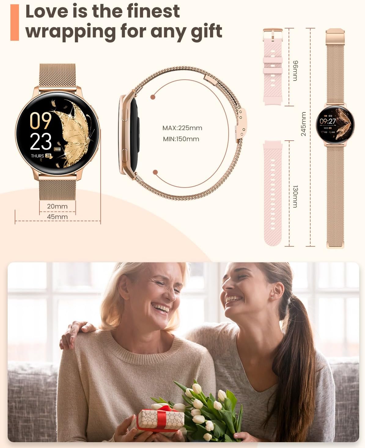 • 【Съчетание на стил и комфорт】Дамският смарт часовник Sanorum има 1,39-инчов дисплей с резолюция 360 x 360 за реалистично изживяване при гледане. Пълната функционалност на сензорния екран и покритието против пръстови отпечатъци осигуряват комфортно усещане при допир. Две включени гривни се адаптират към различни начини на живот: стоманената гривна в цвят розово злато е идеална за работа и срещи, докато розовата силиконова каишка е идеална за свободното време и спорт. С тегло от 29 грама, часовникът е лек и прави модата лесна за жените.