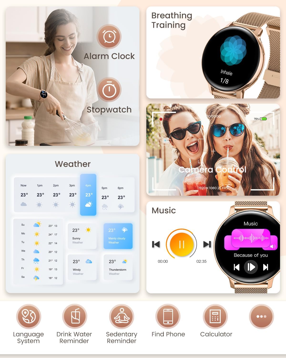 • Удобна комуникация и разговори: дамският смарт часовник с функция за телефон е оборудван с технология Bluetooth 5.3 и по този начин осигурява навременна комуникация и безпроблемни разговори. Независимо дали става въпрос за разговори, текстови съобщения или известия от социалните мрежи, можете да правите всичко на часовника си, без да се налага постоянно да гледате телефона си. Освен това, вграденият микрофон и високоговорител поддържат HD разговори, осигурявайки ясно предаване на глас дори в шумна среда.