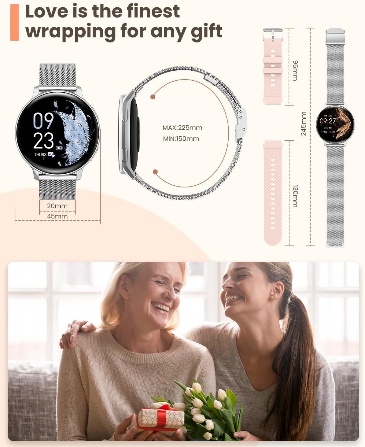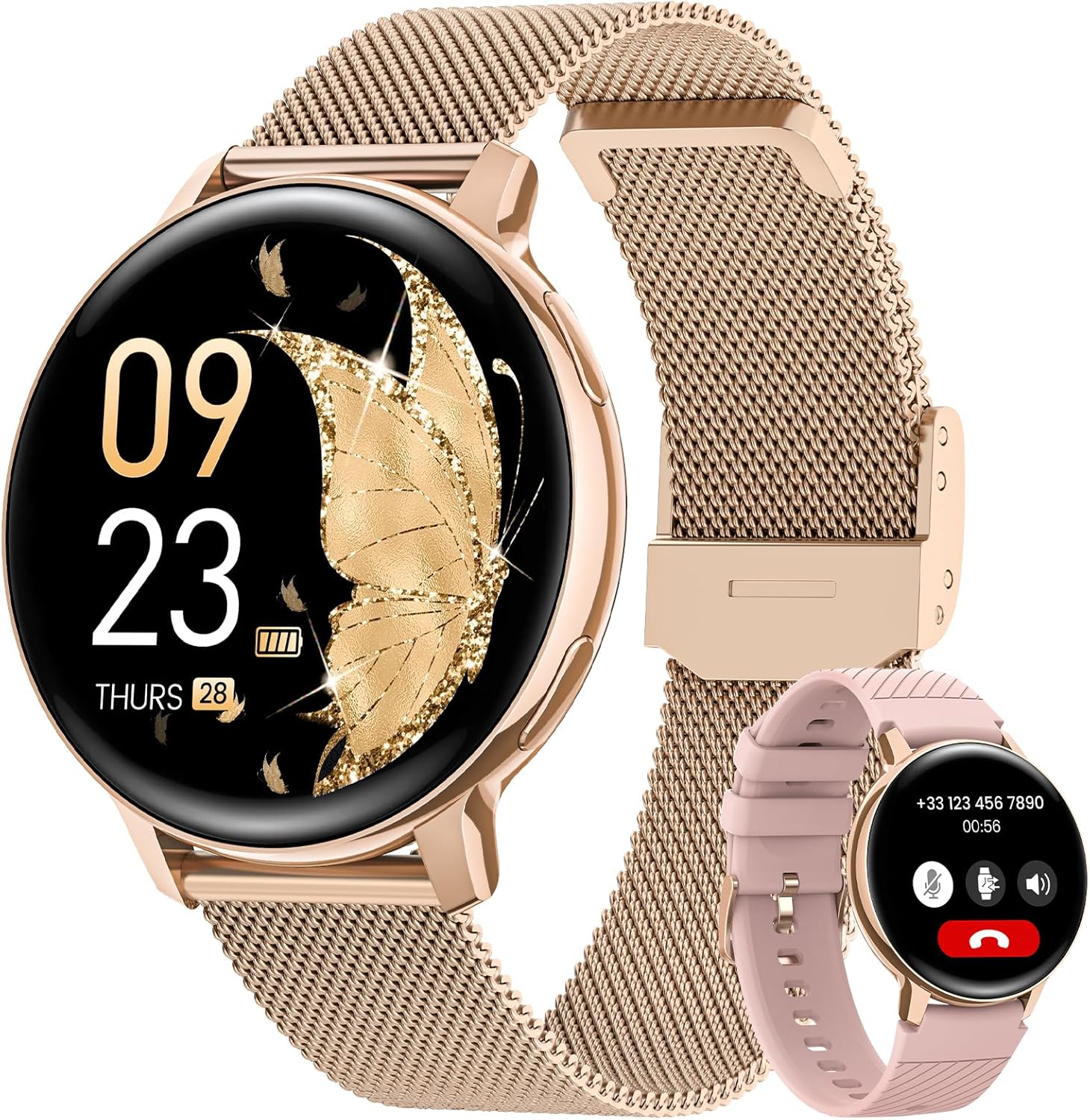 • 【Съчетание на стил и комфорт】Дамският смарт часовник Sanorum има 1,39-инчов дисплей с резолюция 360 x 360 за реалистично изживяване при гледане. Пълната функционалност на сензорния екран и покритието против пръстови отпечатъци осигуряват комфортно усещане при допир. Две включени гривни се адаптират към различни начини на живот: стоманената гривна в цвят розово злато е идеална за работа и срещи, докато розовата силиконова каишка е идеална за свободното време и спорт. С тегло от 29 грама, часовникът е лек и прави модата лесна за жените.