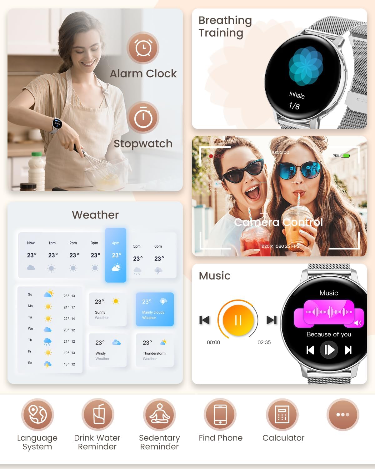 • Удобна комуникация и разговори: дамският смарт часовник с функция за телефон е оборудван с технология Bluetooth 5.3 и по този начин осигурява навременна комуникация и безпроблемни разговори. Независимо дали става въпрос за разговори, текстови съобщения или известия от социалните мрежи, можете да правите всичко на часовника си, без да се налага постоянно да гледате телефона си. Освен това, вграденият микрофон и високоговорител поддържат HD разговори, осигурявайки ясно предаване на глас дори в шумна среда.