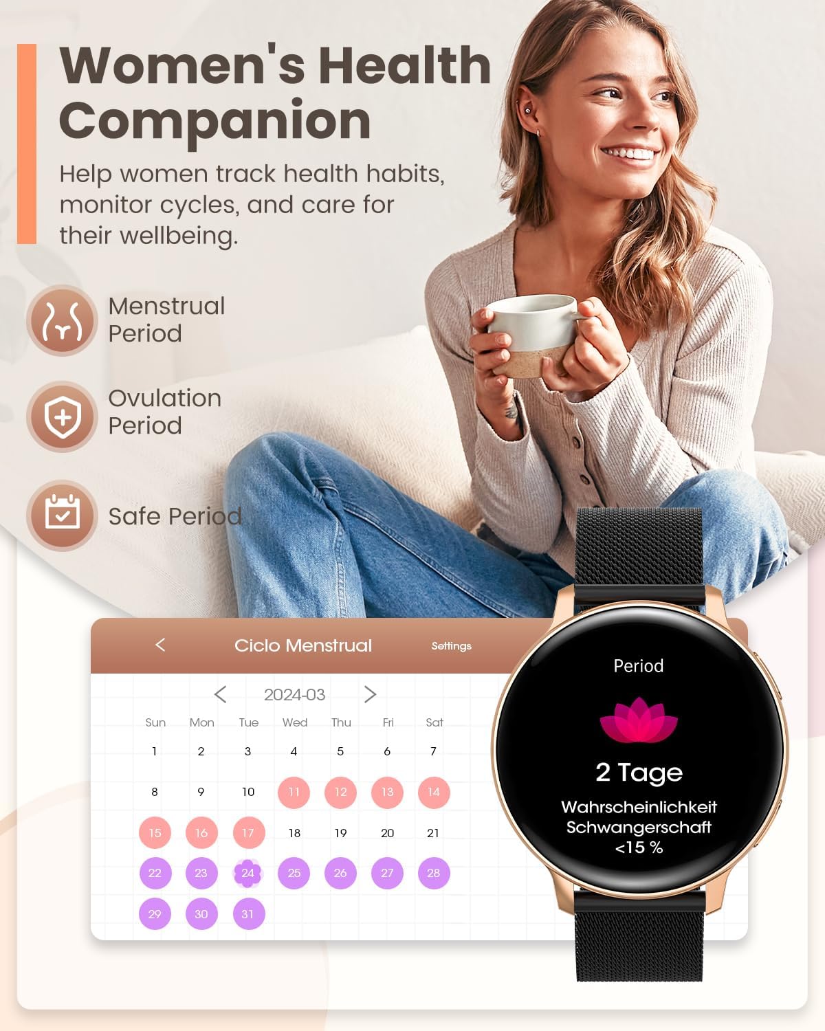 • Придружител за женското здраве: този дамски смарт часовник следи менструалния цикъл на жените по време на четири фази: менструация, менструация, овулация и ден на овулация. Функцията за напомняне за менструация напомня на жените да се подготвят за нея преди началото на цикъла си и по този начин им помага да контролират по-добре менструалния си цикъл. Той също така се синхронизира с мобилни приложения, за да улесни ежедневието и управлението на здравето. Този смарт часовник е проектиран да осигури на жените по-интимно и интелигентно потребителско изживяване.