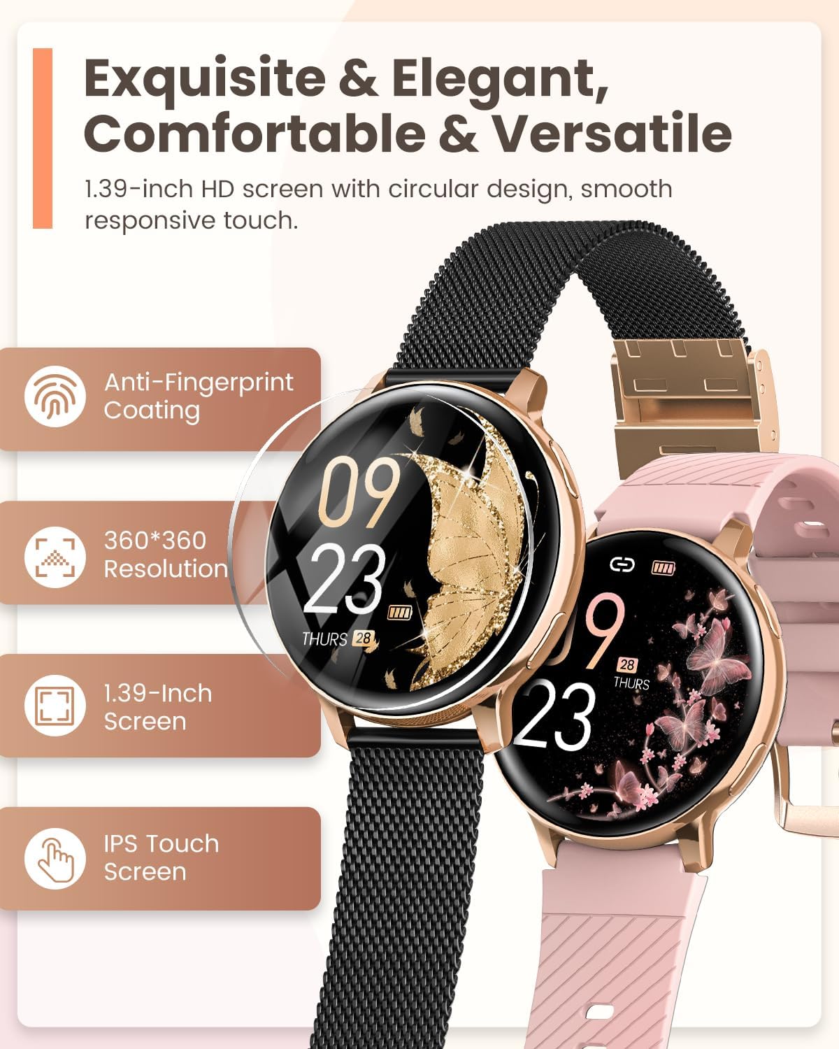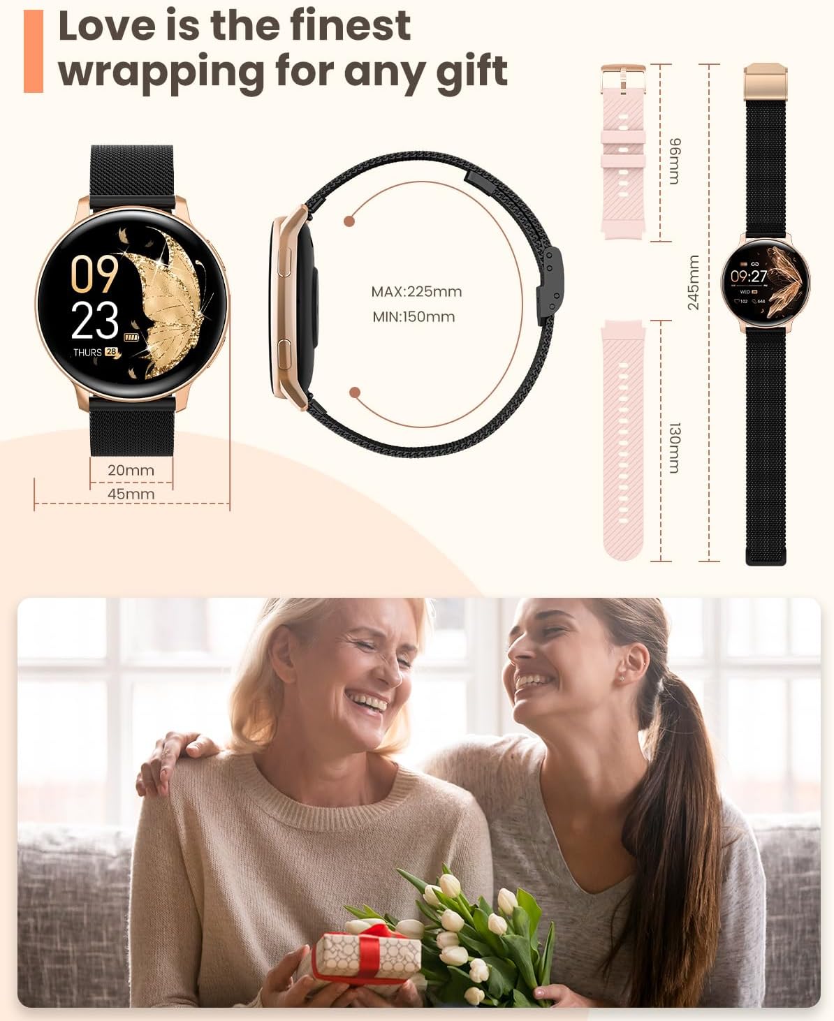 • 【Съчетание на стил и комфорт】Дамският смарт часовник Sanorum има 1,39-инчов дисплей с резолюция 360 x 360 за реалистично изживяване при гледане. Пълната функционалност на сензорния екран и покритието против пръстови отпечатъци осигуряват комфортно усещане при допир. Две включени гривни се адаптират към различни начини на живот: стоманената гривна в цвят розово злато е идеална за работа и срещи, докато розовата силиконова каишка е идеална за свободното време и спорт. С тегло от 29 грама, часовникът е лек и прави модата лесна за жените.