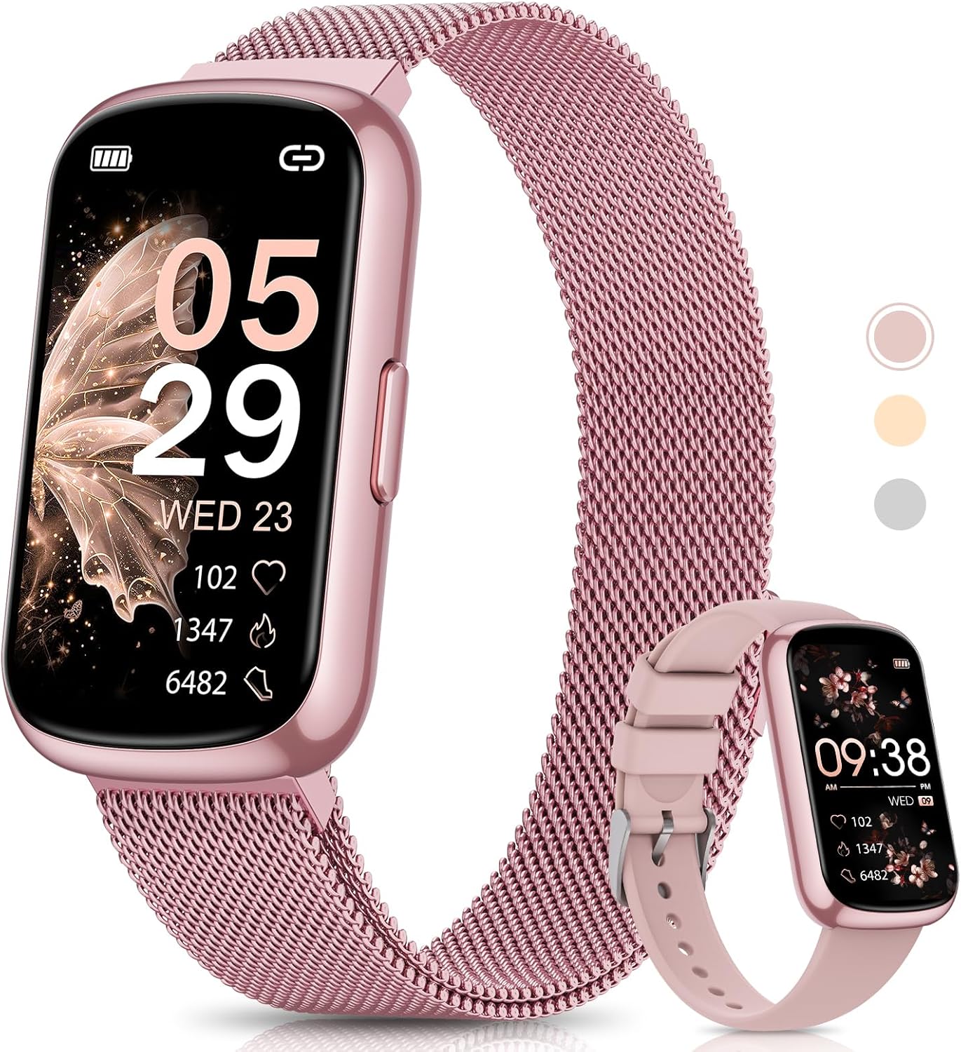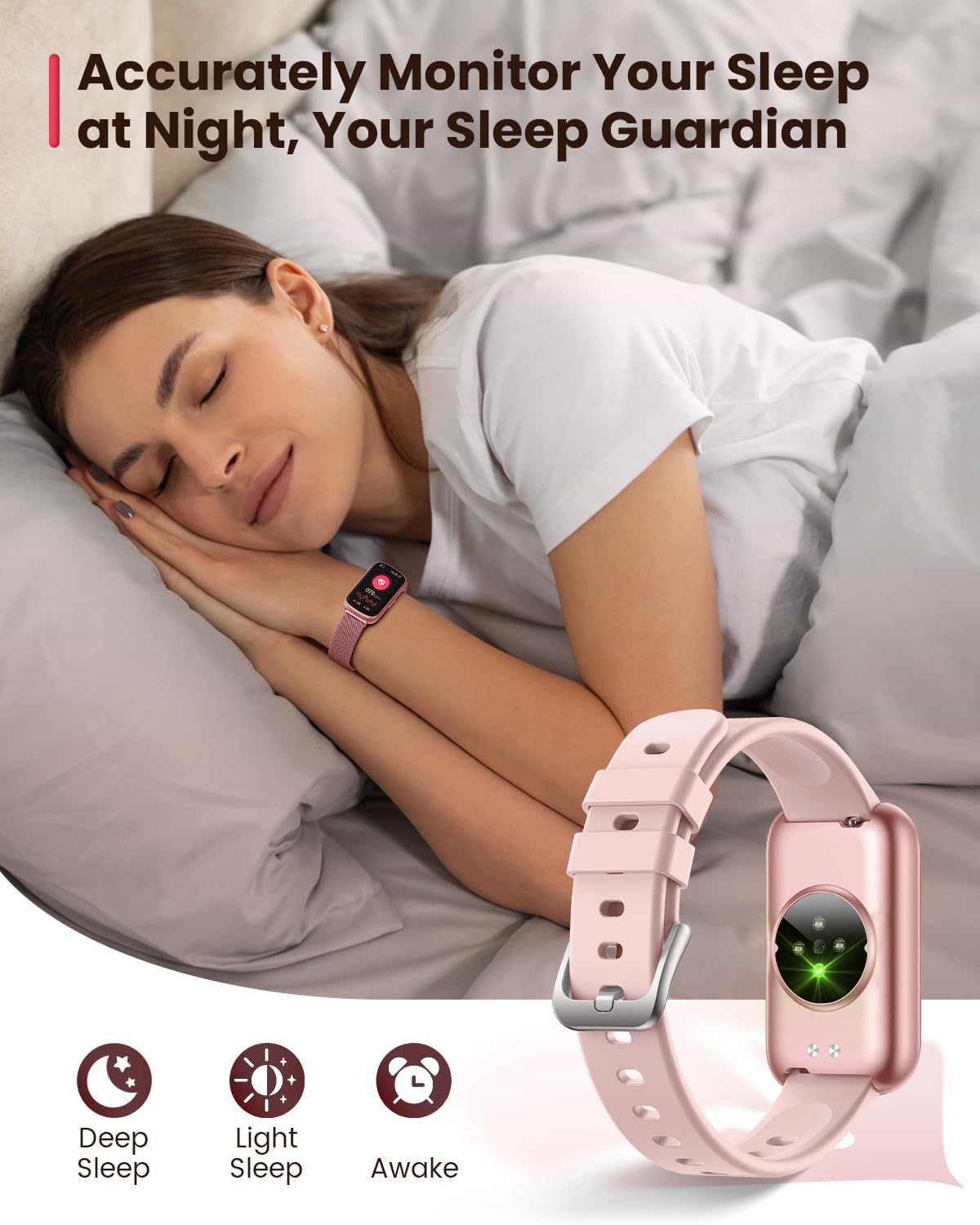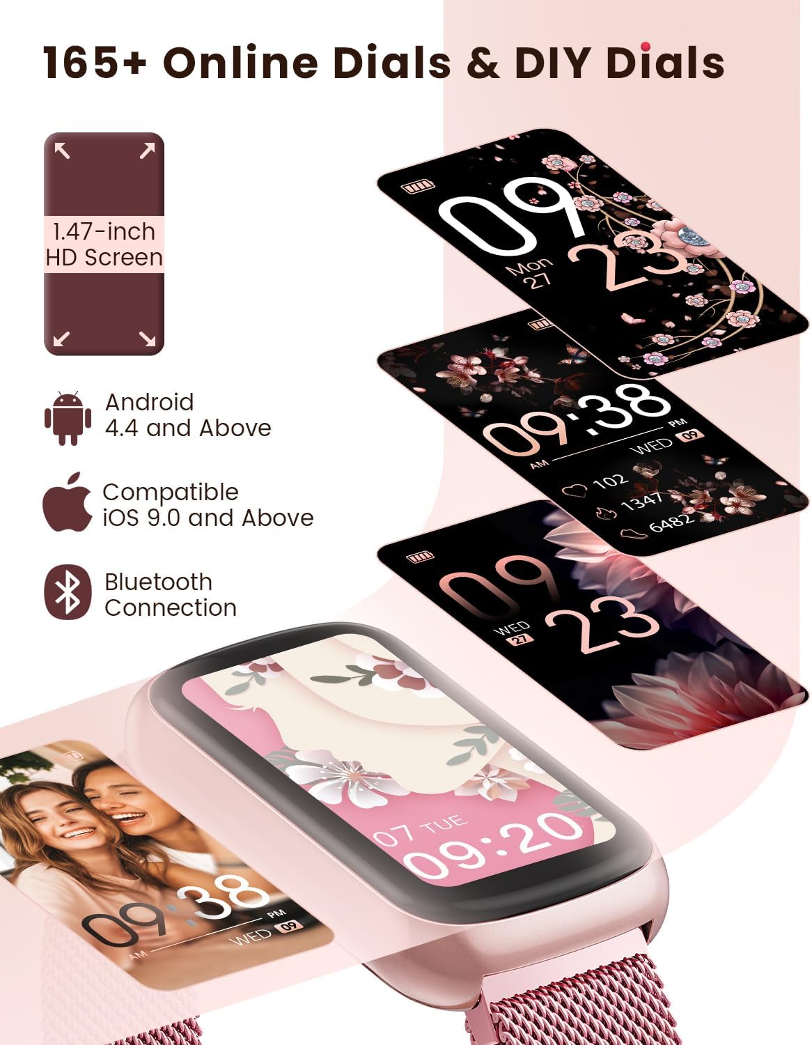 • Ясен екран, комфортно удоволствие: с 1,47-инчов IPS екран за защита на очите, сензорен екран с висока резолюция 172 x 320 и регулируема яркост на екрана, дамският смарт часовник ви предлага по-ясно зрително изживяване и предпазва очите ви. В приложението има 165 циферблата, от които да избирате. Можете също да изберете свои собствени снимки, за да проектирате циферблата с различни стилове и безплатна настройка.