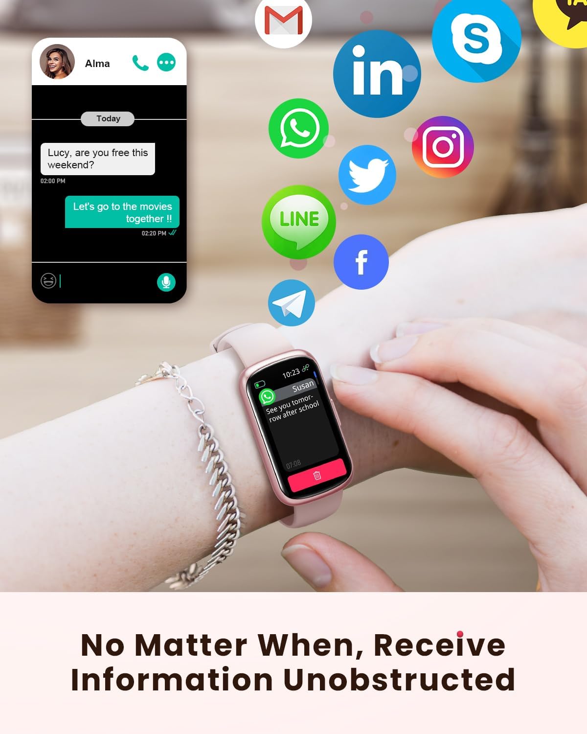 • Получавайте нови съобщения на китката си: дамският смарт часовник се свързва чрез Bluetooth, можете да получавате известия от SMS, Facebook, WhatsApp, Instagram и други социални приложения. Можете да получавате и гледате последните новини, когато сте заети, без да пропускате съобщение, или да затворите телефона, когато ви е неудобно. Дамският часовник е съвместим с iOS 9.0 и по-нови версии/Android 4.4 и по-нови версии.
