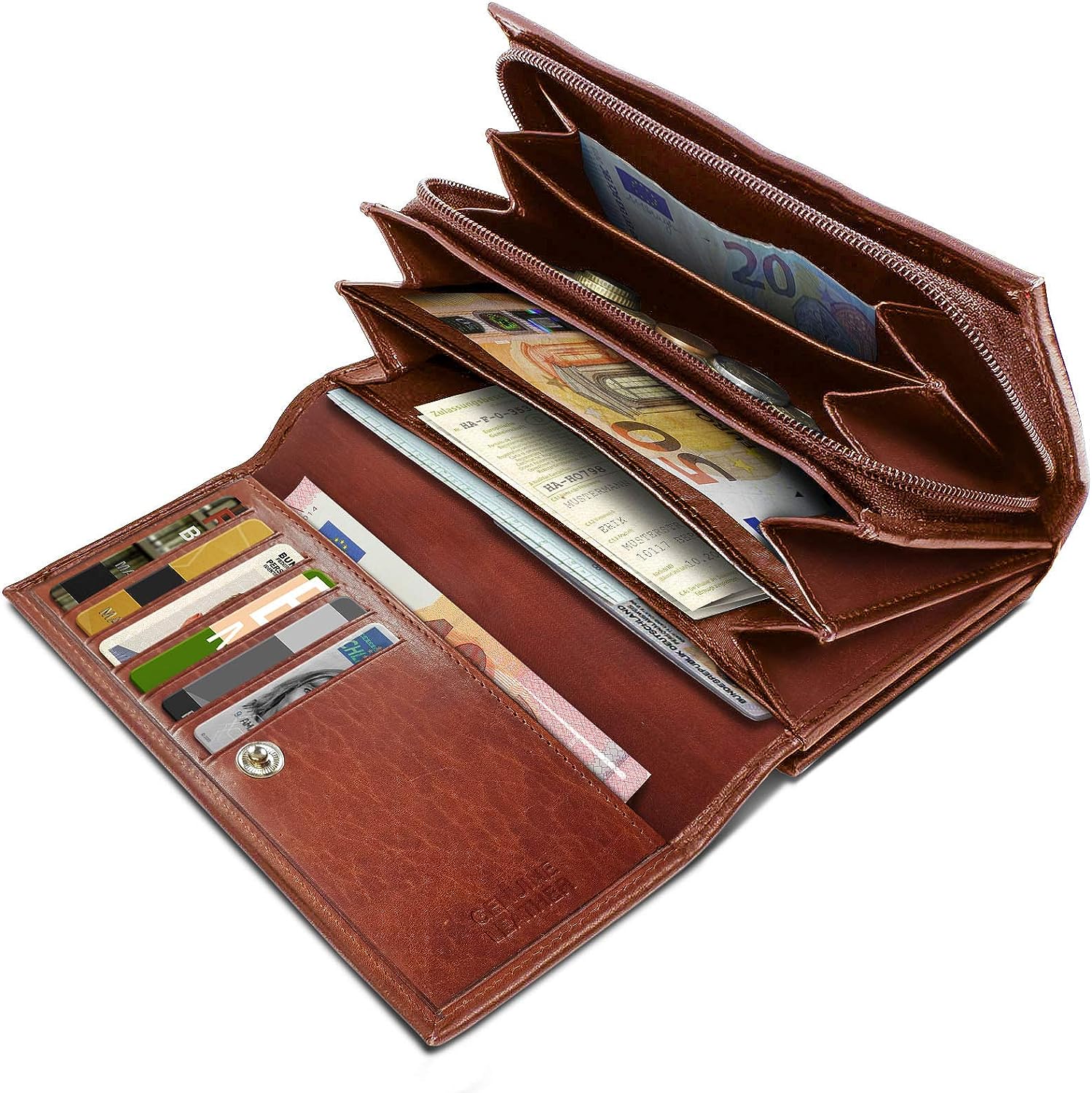 • 18 слота за карти, 6 плоски отделения за банкноти и др. 2 големи джоба за банкноти, 1 голямо отделение за монети с цип.