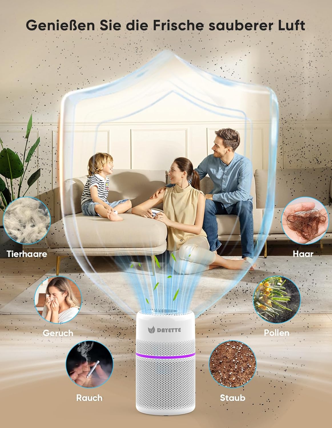 • Гарантиран релаксиращ сън само с 20 dB: Насладете се на тишината и спокойствието за дълбок нощен сън. Нашият пречиствател на въздух Dayette предлага множество режими на работа и 3 избираеми нива на вентилатора. В специален режим на сън, той работи с ултратиха работа от само 20 dB. Този звуков фон е по-тих от шепот и гарантира абсолютно необезпокояван, спокоен сън в пречистен въздух дори за хора с лек сън.