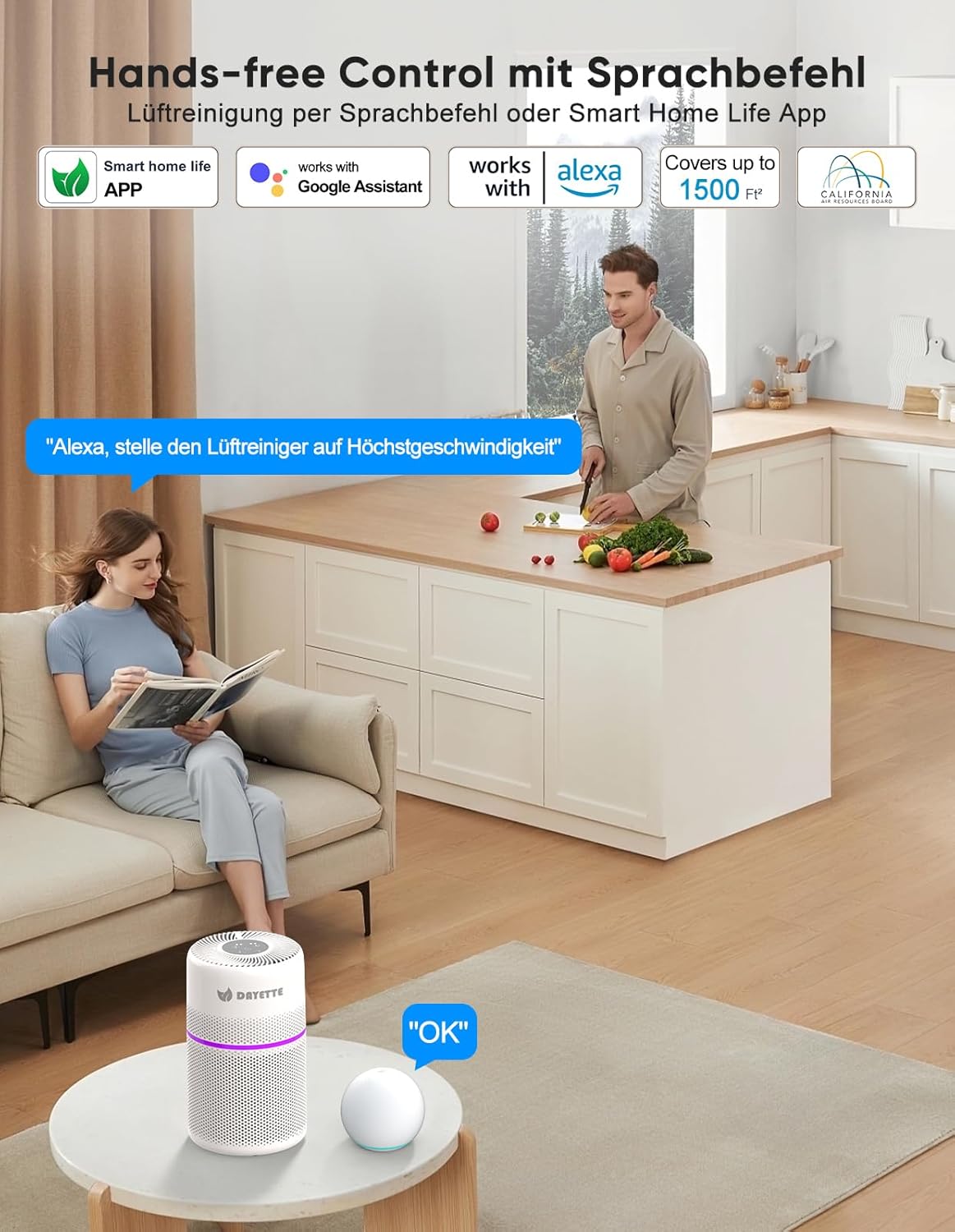 DAYETTE Интелигентен пречиствател на въздух за хол и спалня, с управление чрез приложение/Alexa и 7-цветна нощна светлина, HEPA 13 филтър, елиминира мухъл, прах, косми от домашни любимци и миризми