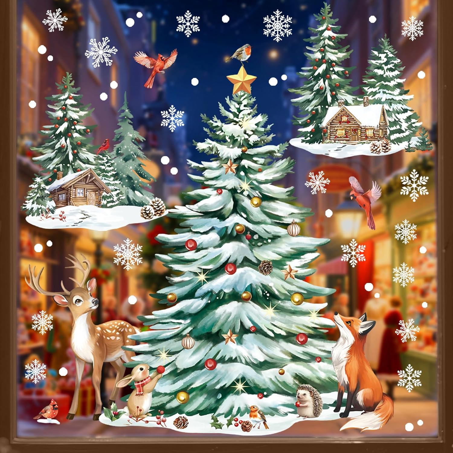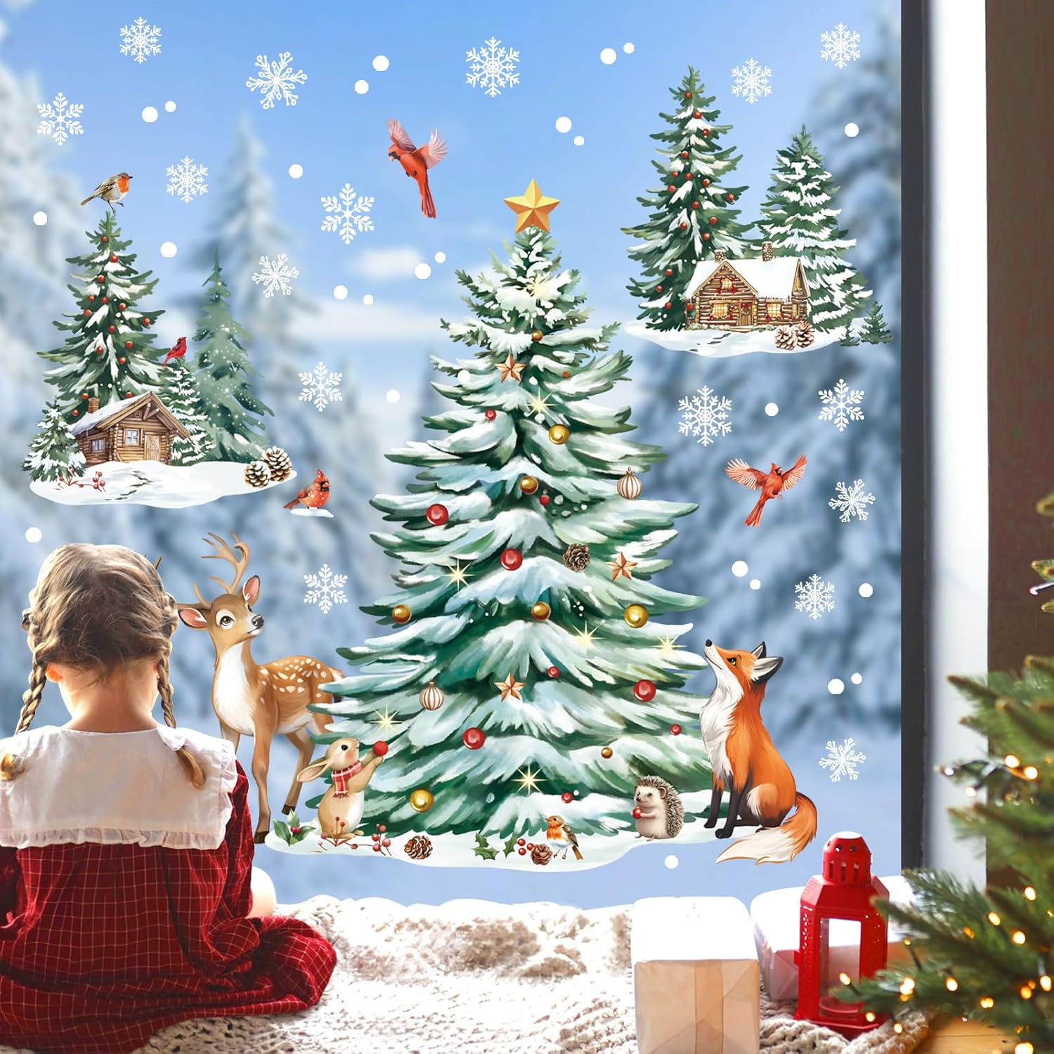 decalmile Стикери за прозорци Коледна елха Стикери за прозорци Коледна елха Снежинки Стикери за прозорци Горски животни Елен Лисица Стикери за прозорец против сблъсък Стъклена декорация за прозорец Зима