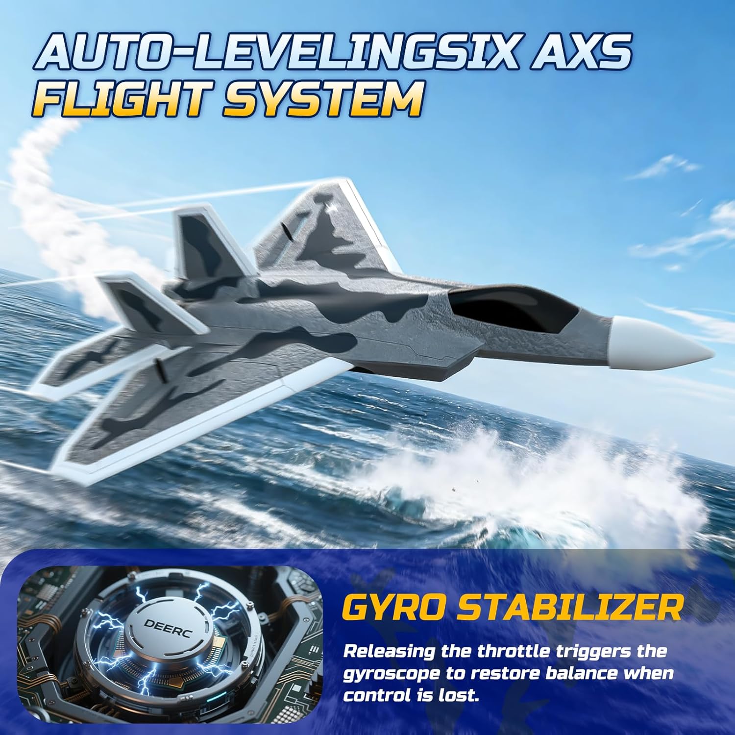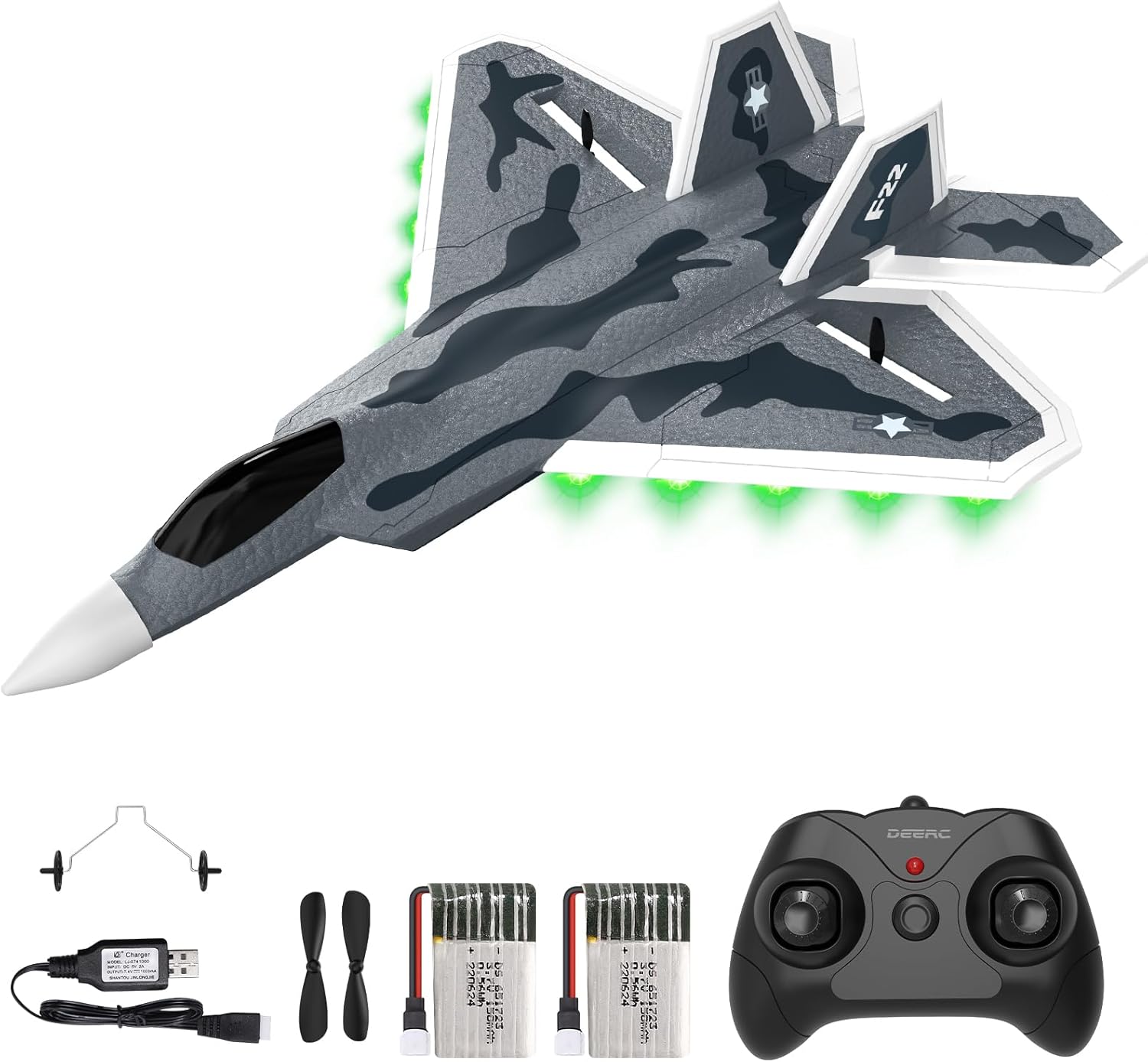 DEERC 2CH F22 Raptor RC самолет със светлини, дистанционно управляема бойна играчка, 2.4GHz 6-осен жироскопичен стабилизатор, RTF планер, реактивен самолет с 2 батерии, за деца, начинаещи