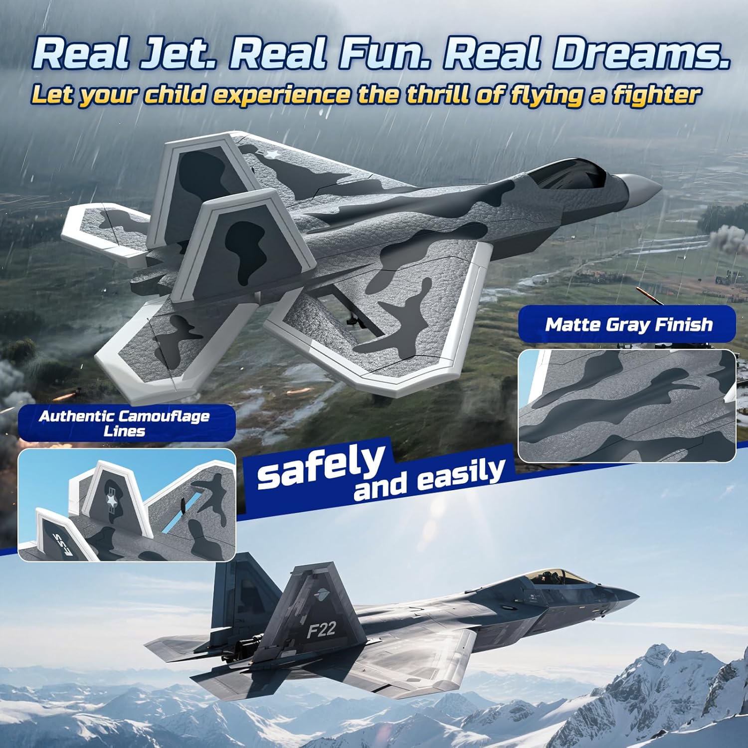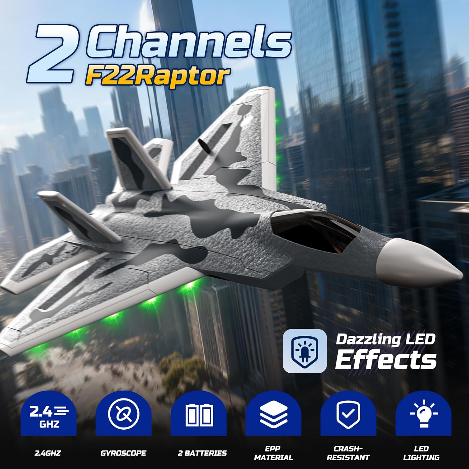 • Реалистичен дизайн на изтребител F22 с LED осветление: Този лесен за начинаещи двуканален RC самолет е моделиран по легендарния F22 Raptor и се отличава със стилен камуфлажен модел и вградено LED осветление за подобрена видимост и външен вид. Благодарение на лесното управление, той е идеален за деца и начинаещи.
