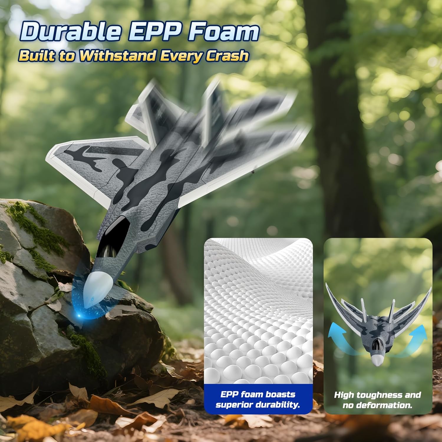 • Удароустойчива EPP пяна - издържа дори на твърди кацания: Този самолет, изработен от издръжлива, но лека EPP пяна с мек гумен нос, е проектиран да абсорбира удари и да устои на повреди. Това го прави идеален за обучение, полети на открито и безгрижно забавление.